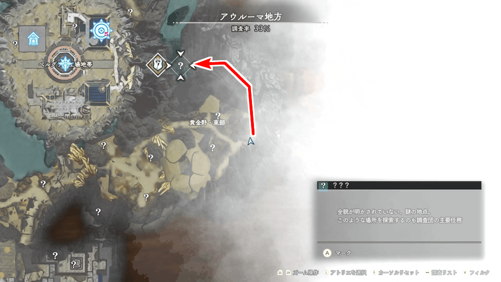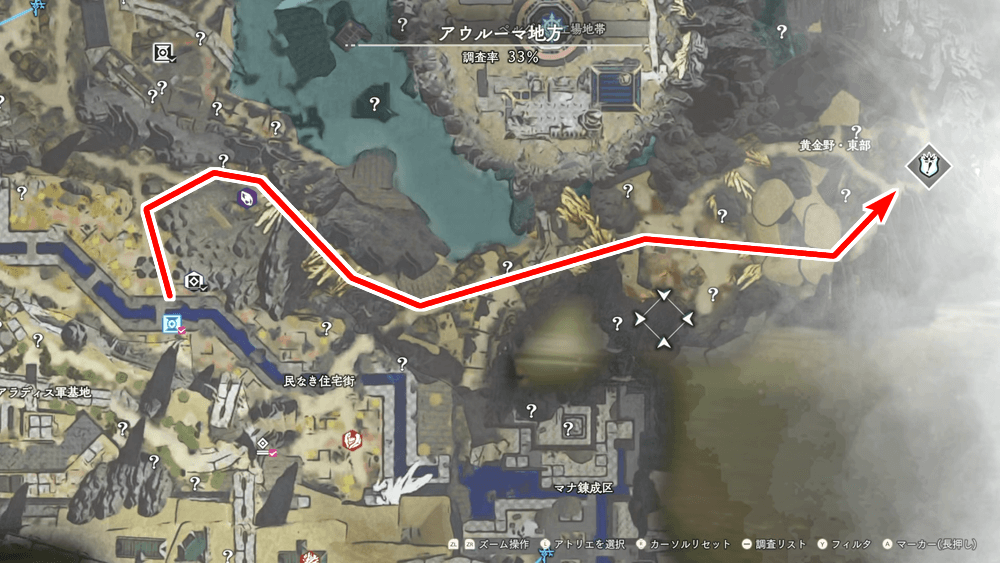 アトリエのイベントが終わったら再びアウルーマ地方へ戻り、ラクーナ地方との境目に向かおう。「住宅街十字路」から東に進んでいけば、目的地に辿り着く。