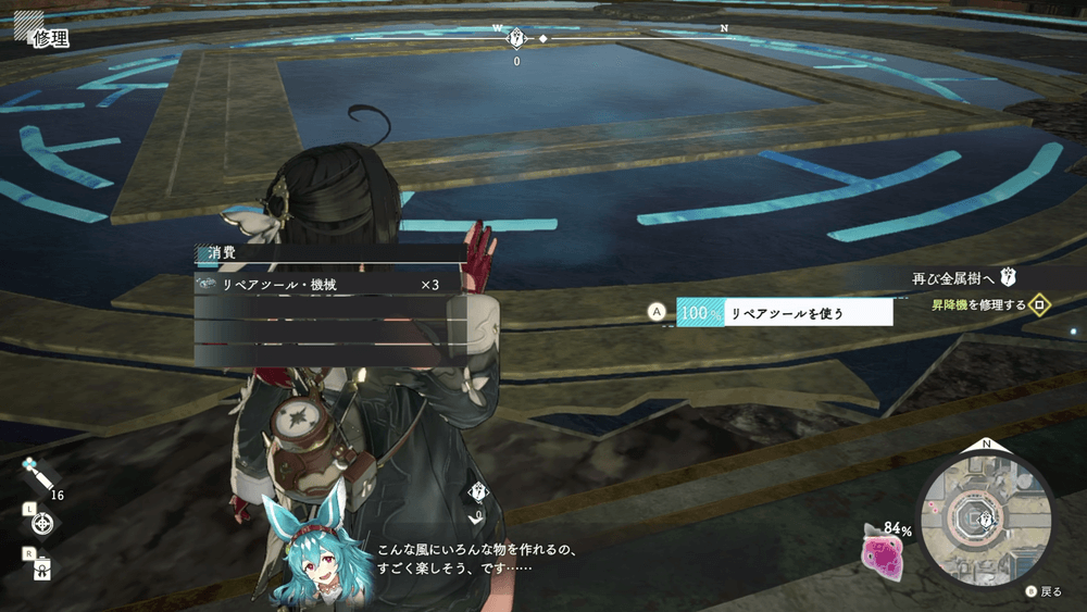 調合を終えたら昇降機へ戻り、修理作業を済ませよう。修理完了後はそのままイベントに突入するため、もし準備忘れがあった場合は修理を終える前に戻ると良い。
