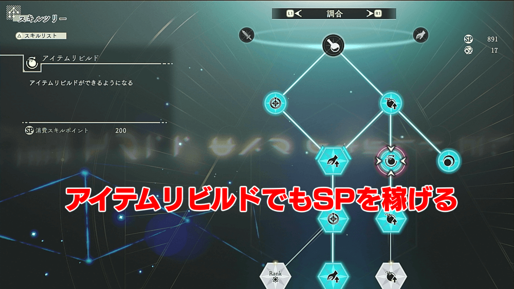 アイテムリビルドでも、調合の際と同じだけのスキルポイントを稼げる。リビルドで稼ぐ場合は完成品の入手はできないものの、レシピを選ぶ手間が省けるため、調合を繰り返すよりも僅かに早くSPを稼げる。