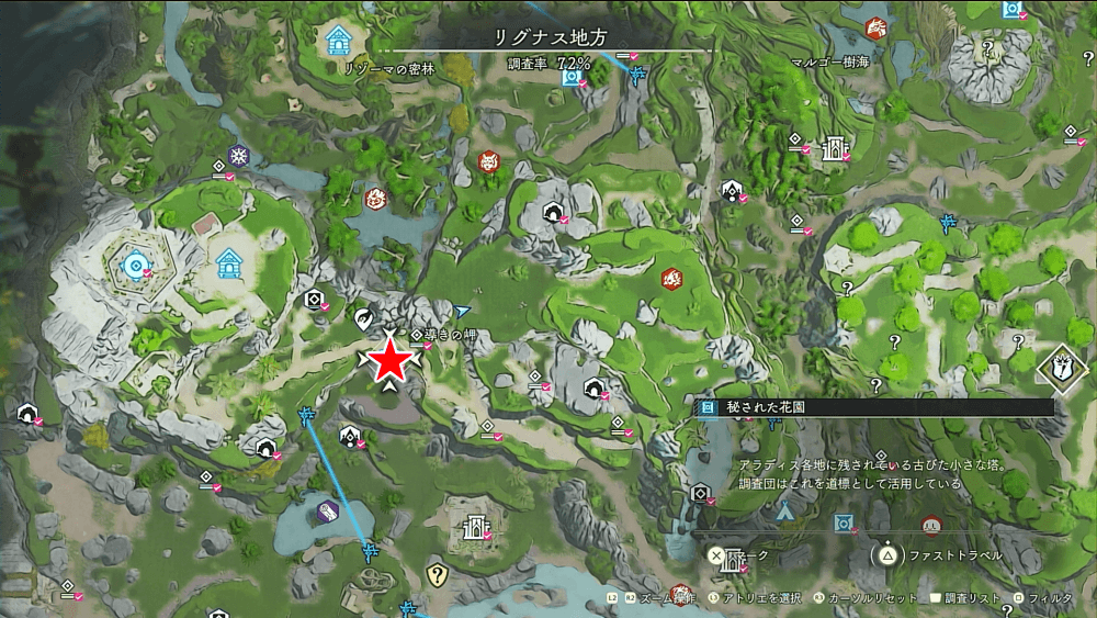 準備ができたら、リグナス地方のドゥクス大灯台付近にある「秘された花園」にファストトラベルしよう。「秘された花園」は最序盤から訪れる場所であるため、少しストーリーを進めていれば既に解放されているはずだ。