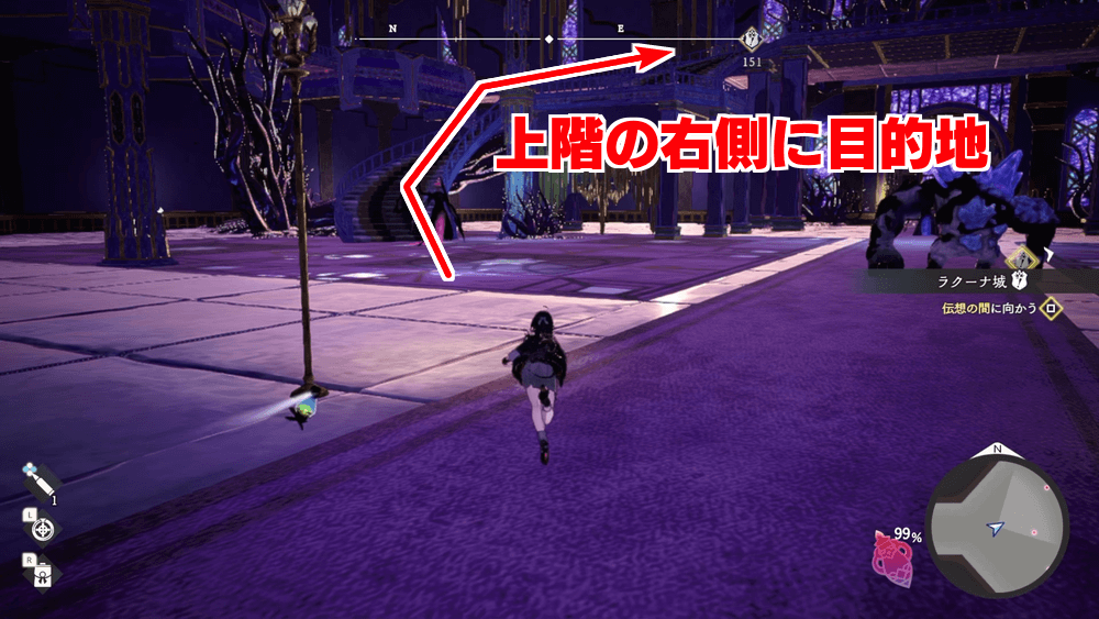 東部のハウジングエリアにファストトラベルで移動し、そこからエレベーターに乗ってラクーナ城へ向かおう。ラクーナ城内部はエナジーを50%前後消費して解除するギミックが非常に多いため、エナジー生成器を作っておくと復帰がスムーズになる。