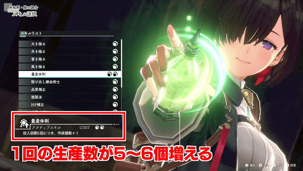 スキルツリーで調合スキルⅡ以上を解禁しているなら、制作時に量産体制を使用しておこう。1回の調合で作れる素材数が増加し、素材作成の手間を減らせる。他に取るスキルがなければ「複製法」も使い、更に個数を2個増やしておくのもおすすめ。