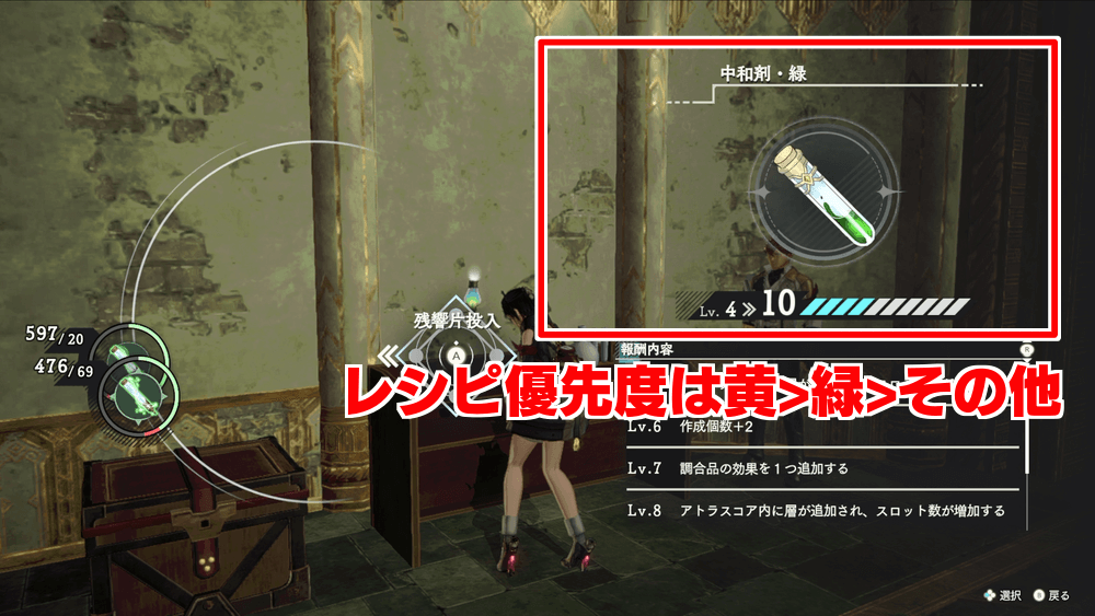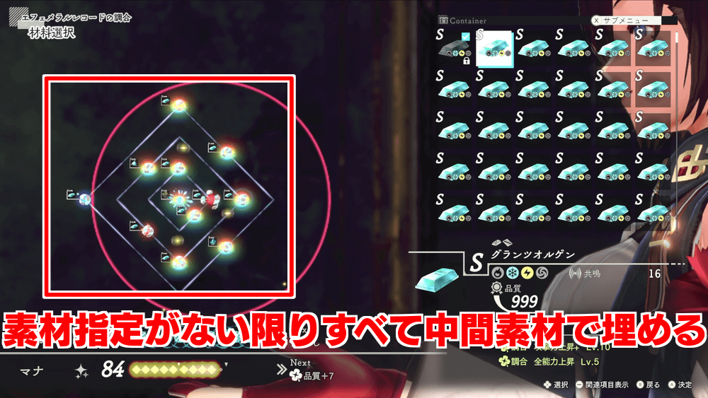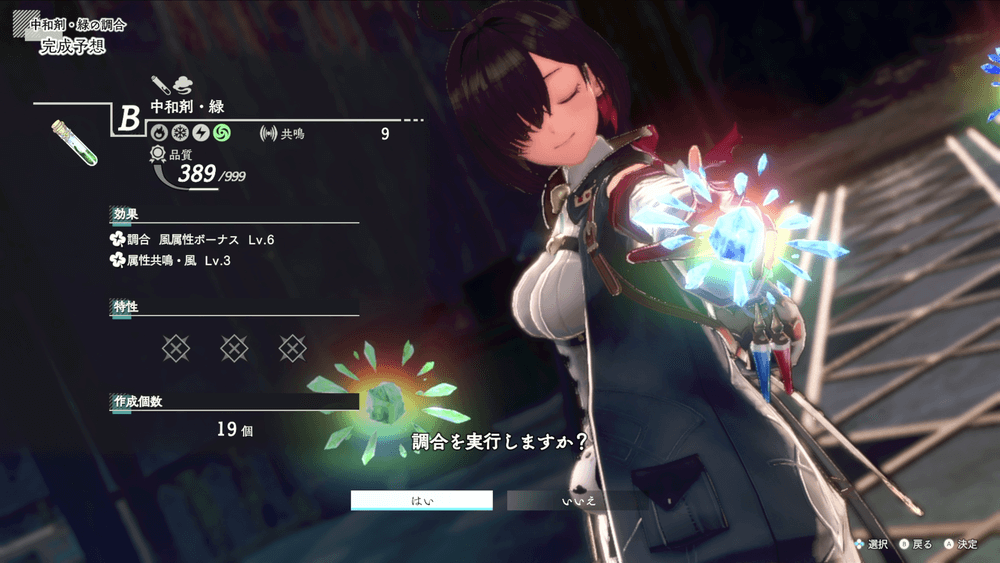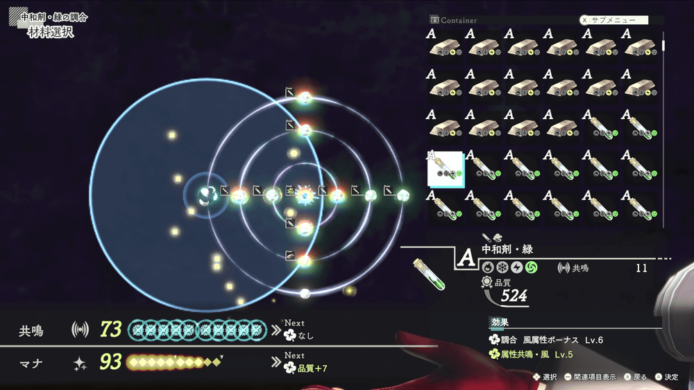 中和剤同士の調合を繰り返し、品質999の中和剤を完成させよう。中和剤は他の素材よりも共鳴範囲が広くなるため、一度作ってしまえば終盤の中間素材作成まで活躍し続ける。