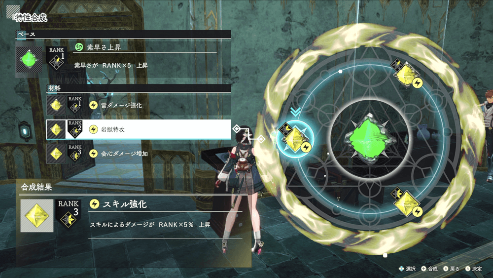 最後に特性合成でランク6の特性を作成し、付与していこう。合成元となる特性は、各地の赤いコア間欠泉から集める必要があるため、時間がかかる。装備を全て組み終えた後、周回して最強の構成を作り切ろう。