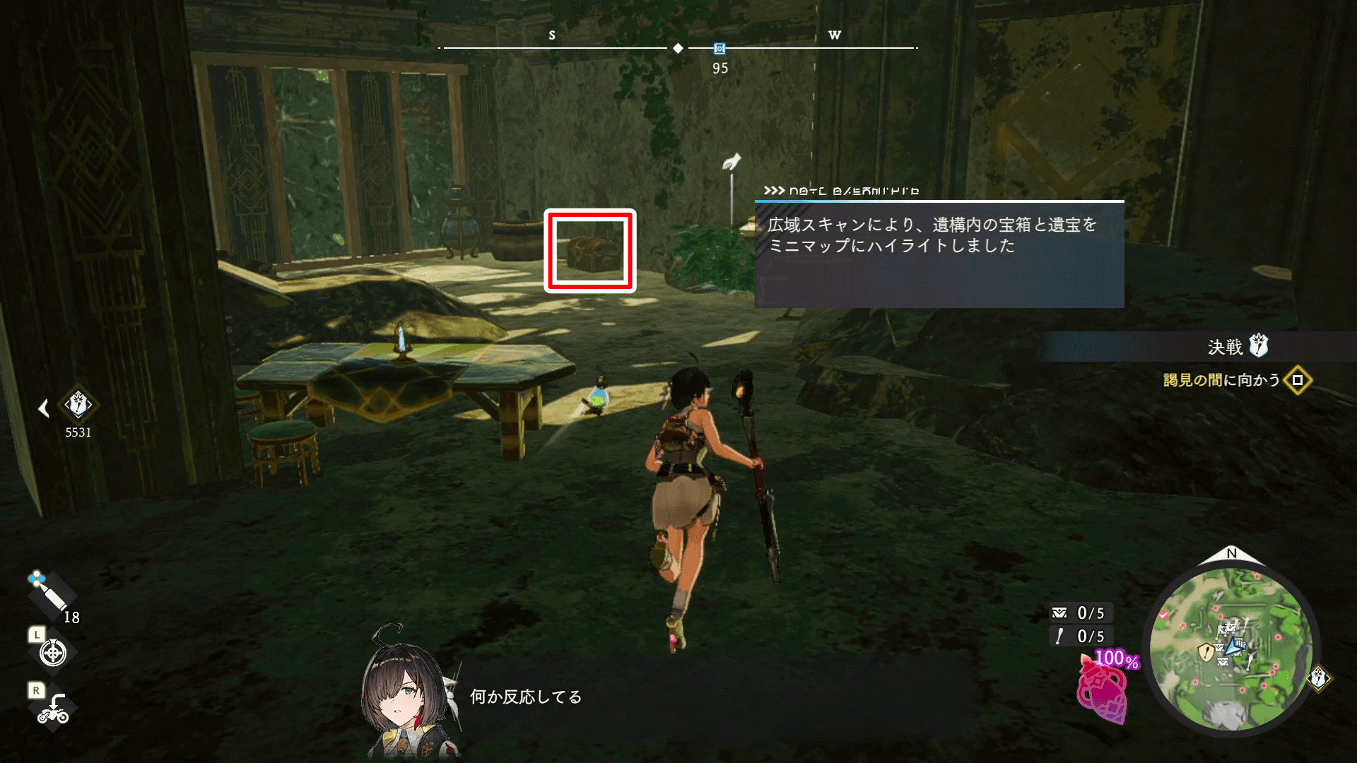 2階の宝箱を回収したら、1階に戻りながら遺宝を回収しよう。広域スキャンを使えば、ミニマップに「!」として場所が表示されるため、マップを頼りに集めると良い。