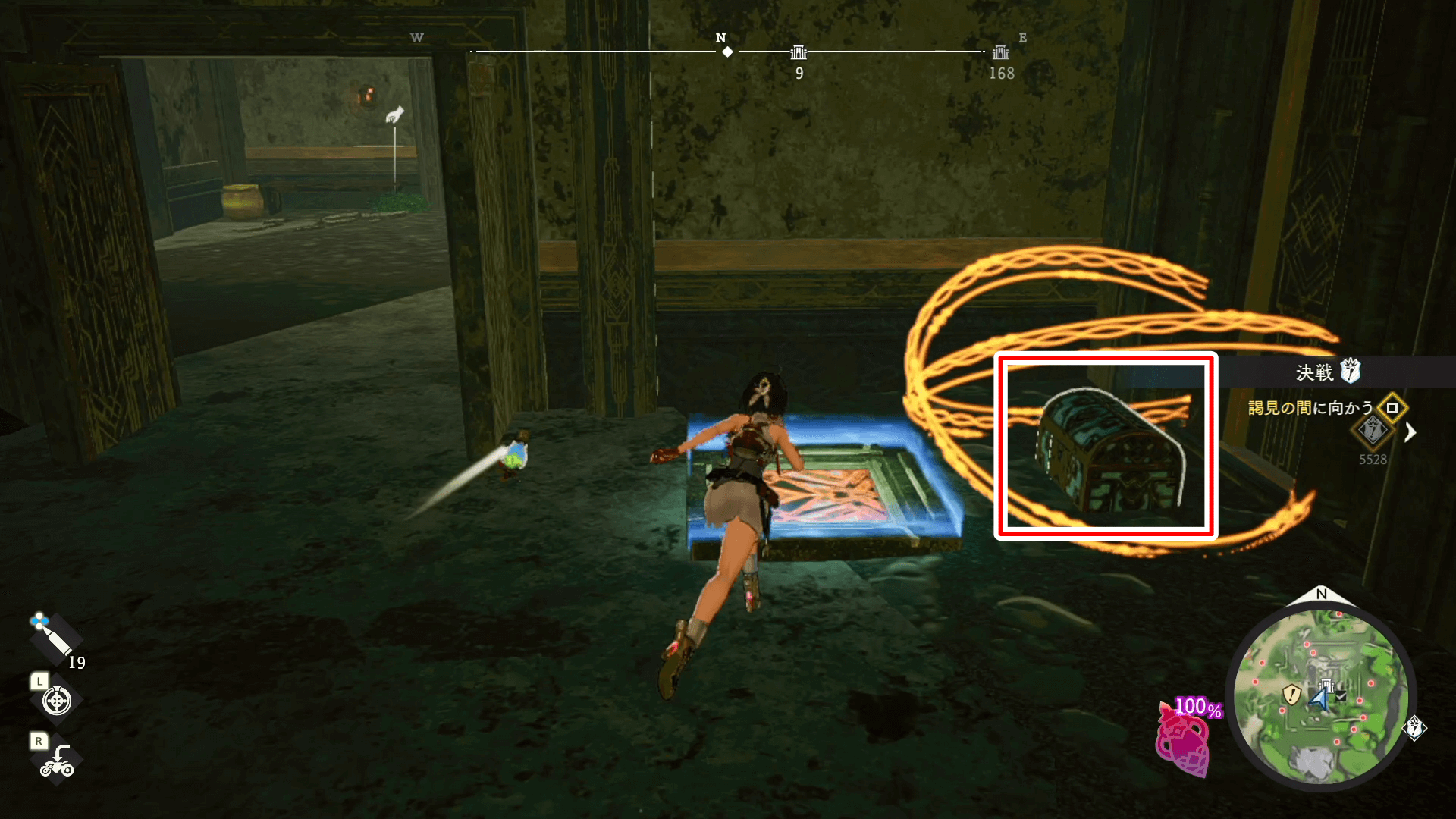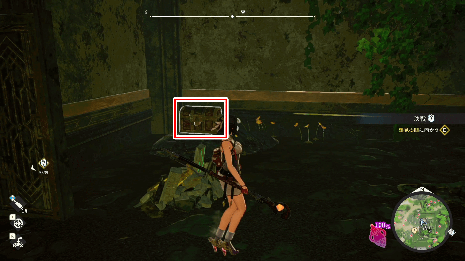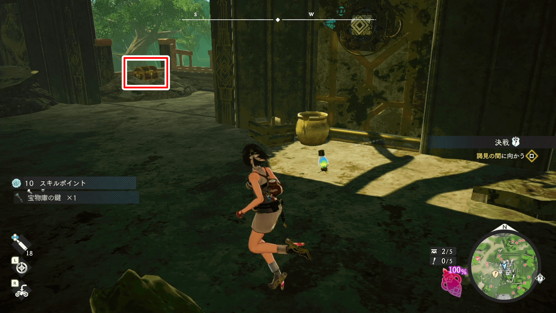 見える範囲の遺宝を集めたら、入口を背にして右側にあるスイッチを押そう。射撃でスイッチを起動すると、ドアが開いて中に入れる。