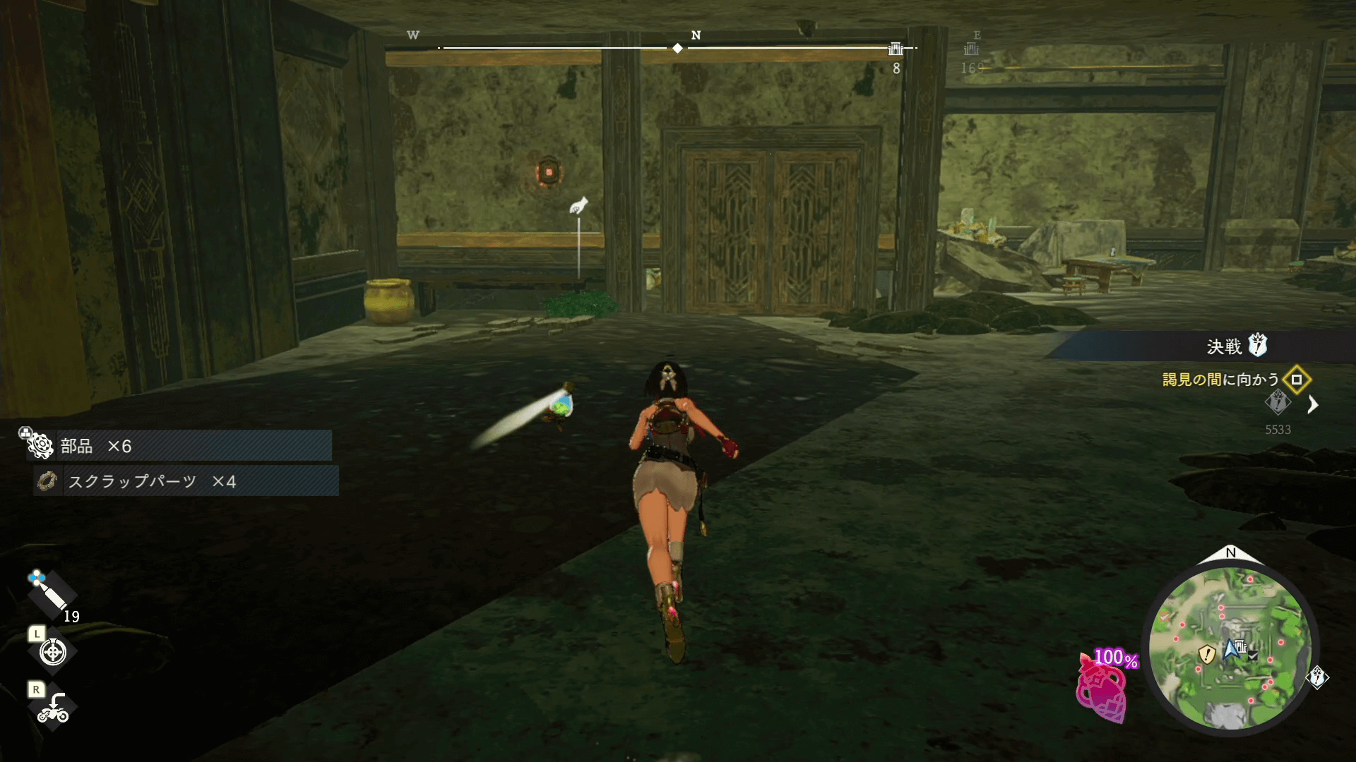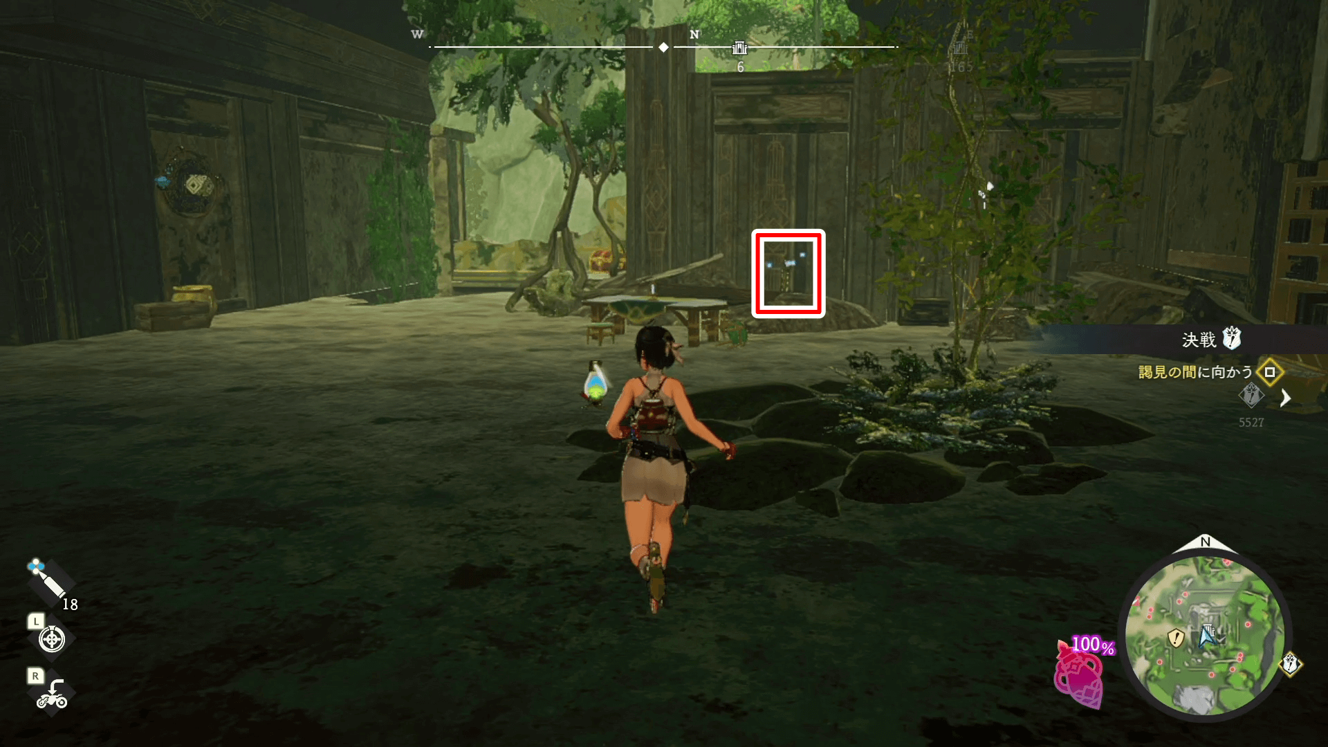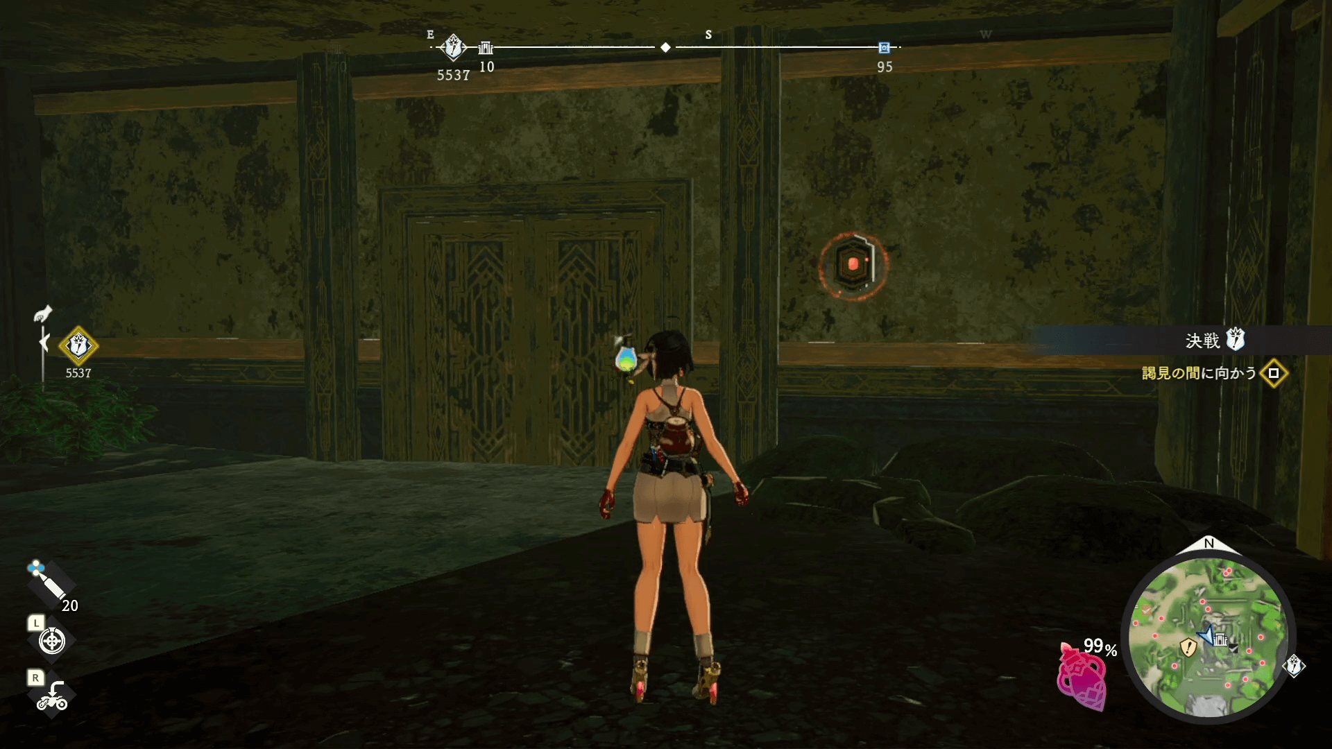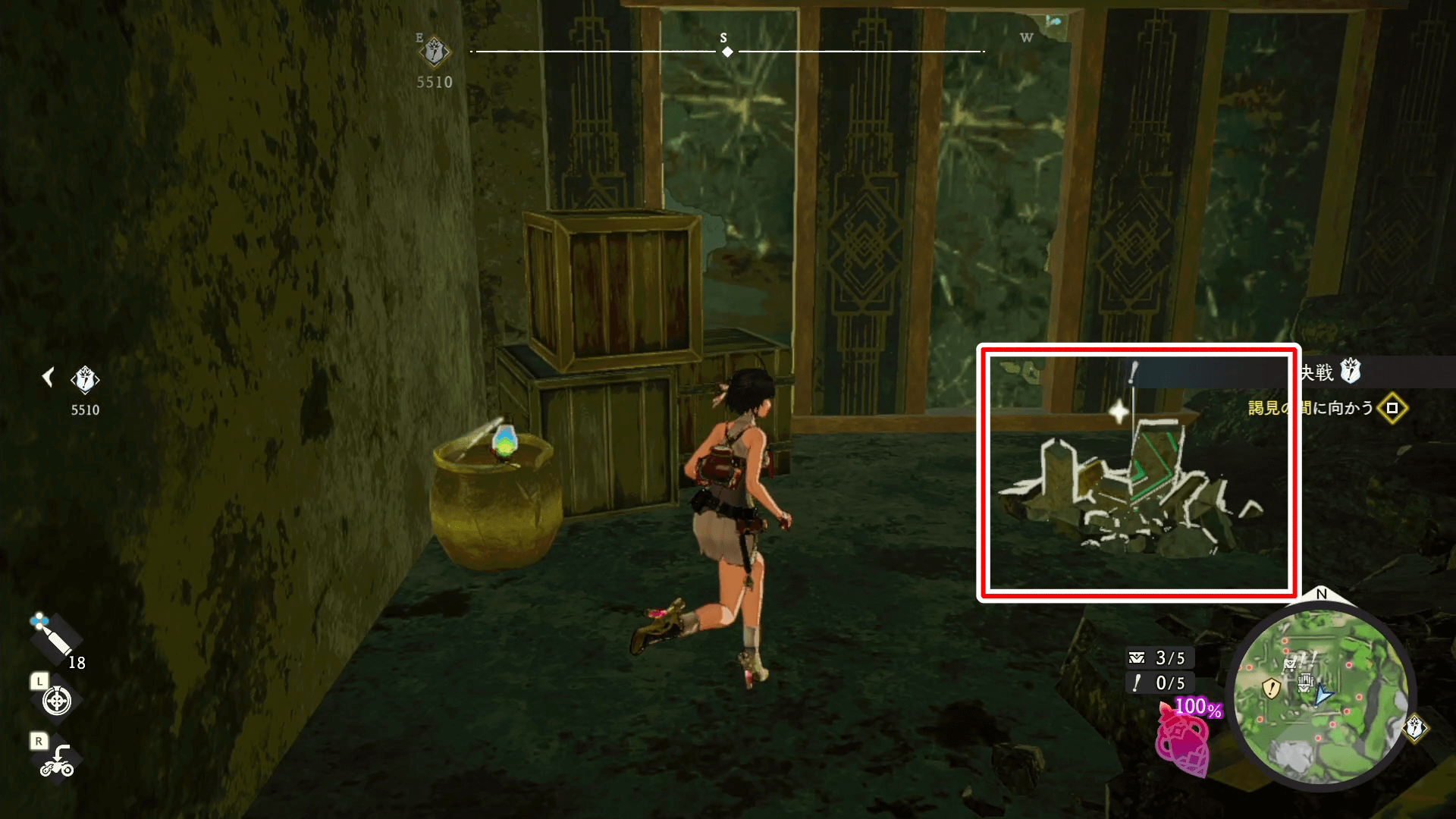 見える範囲の遺宝を集めたら、入口を背にして右側にあるスイッチを押そう。射撃でスイッチを起動すると、ドアが開いて中に入れる。