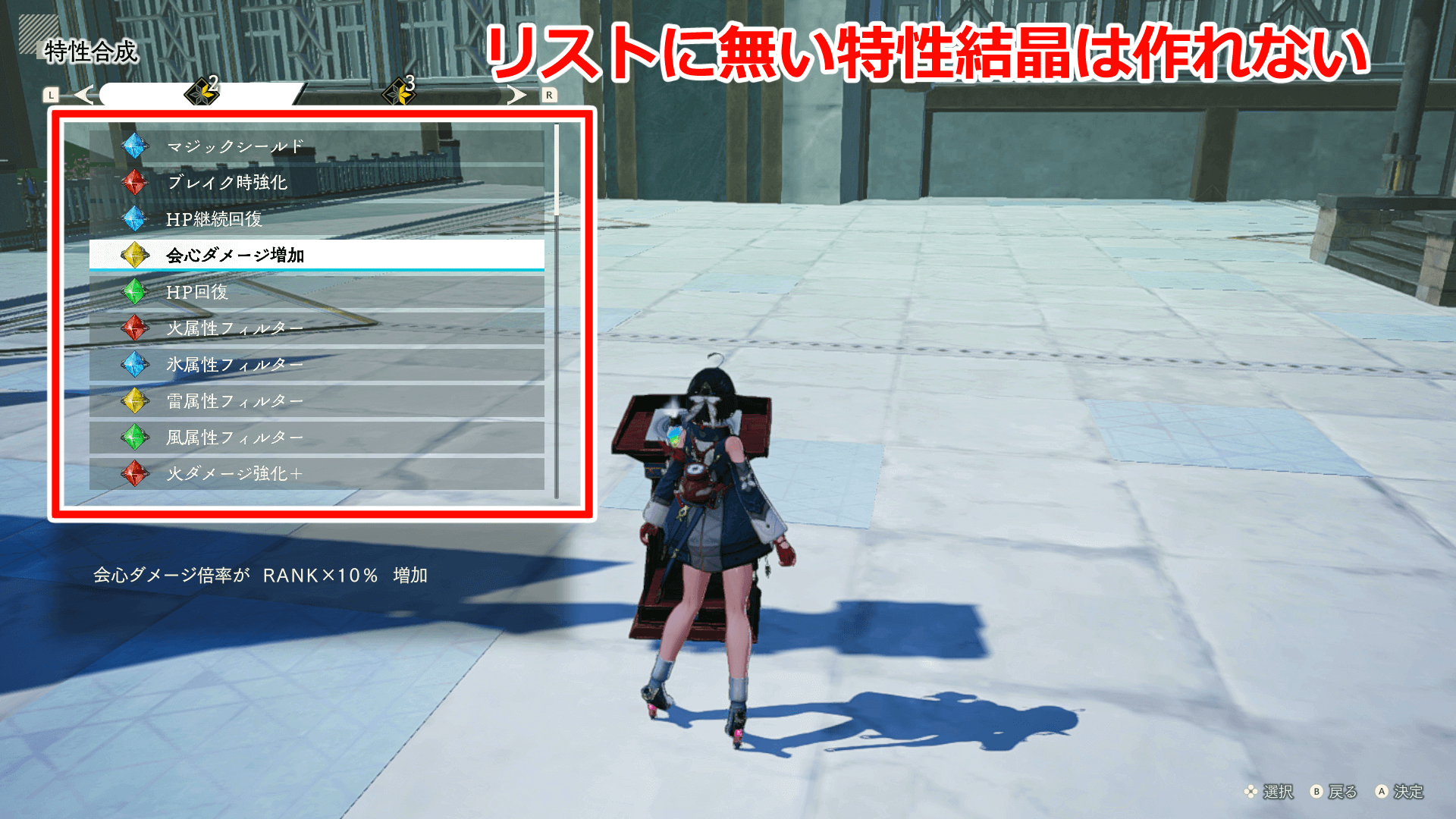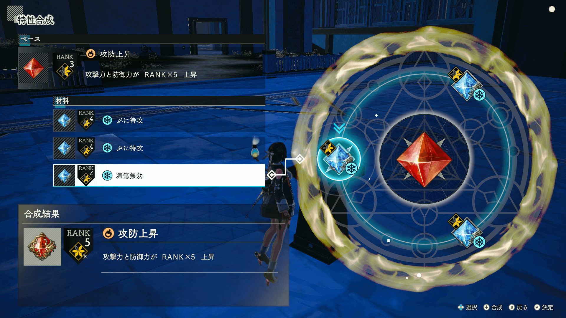 リストから作りたい特性結晶を選択したら、作成で合成が可能。ベースと材料を自動で選んでくれるため、問題がなければそのまま合成しよう。