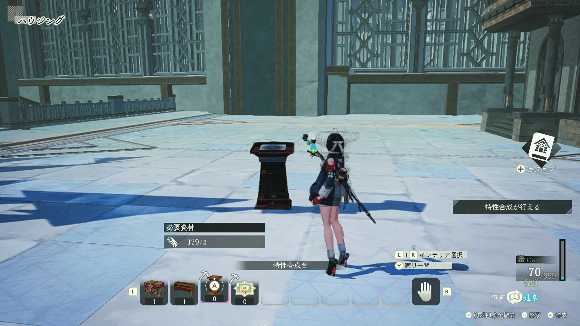 特性結晶合成をするには、ハウジングエリアへ入って「特性合成台」を設置しよう。以降は特性合成台から特性結晶の合成が可能になる。