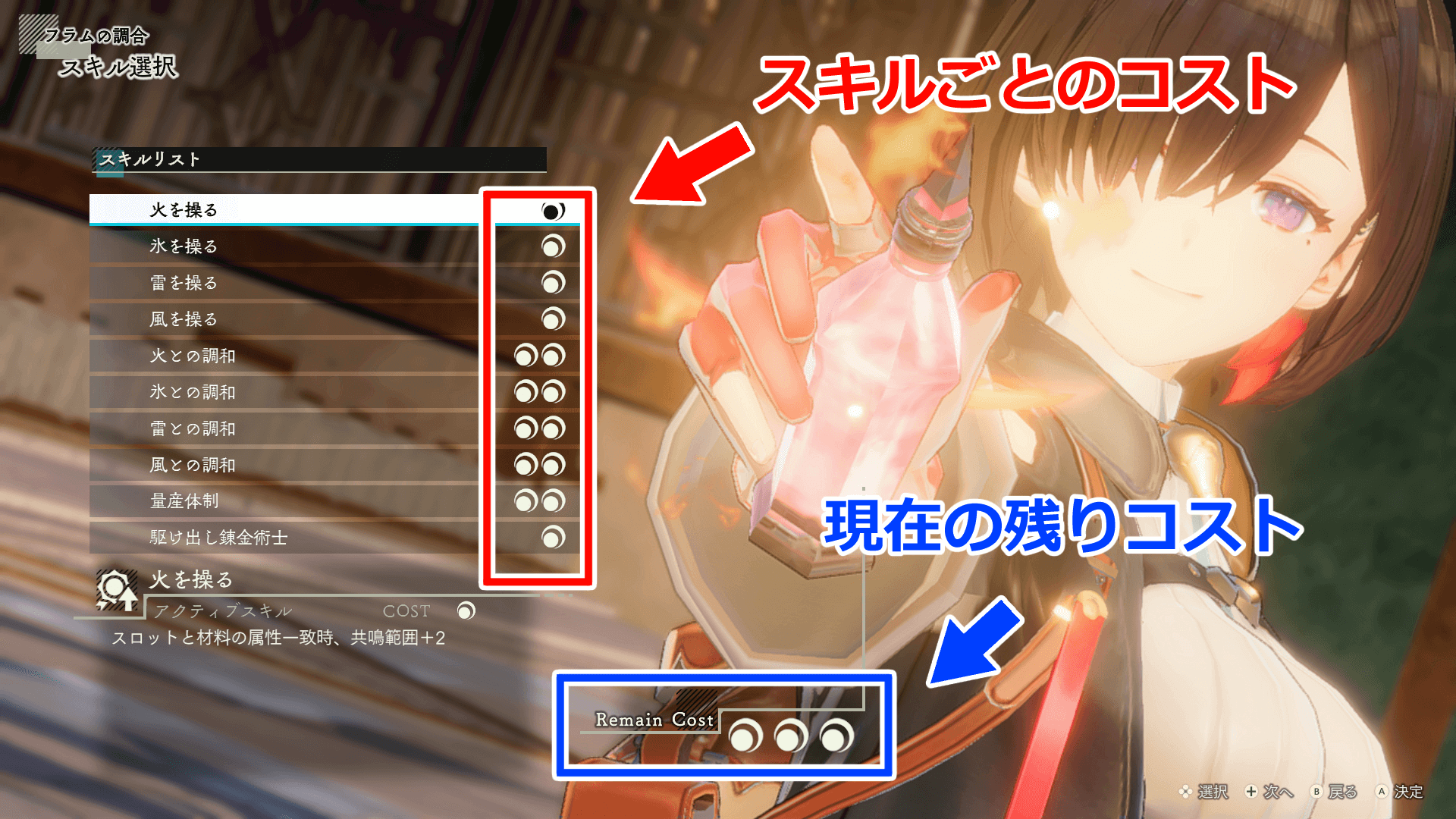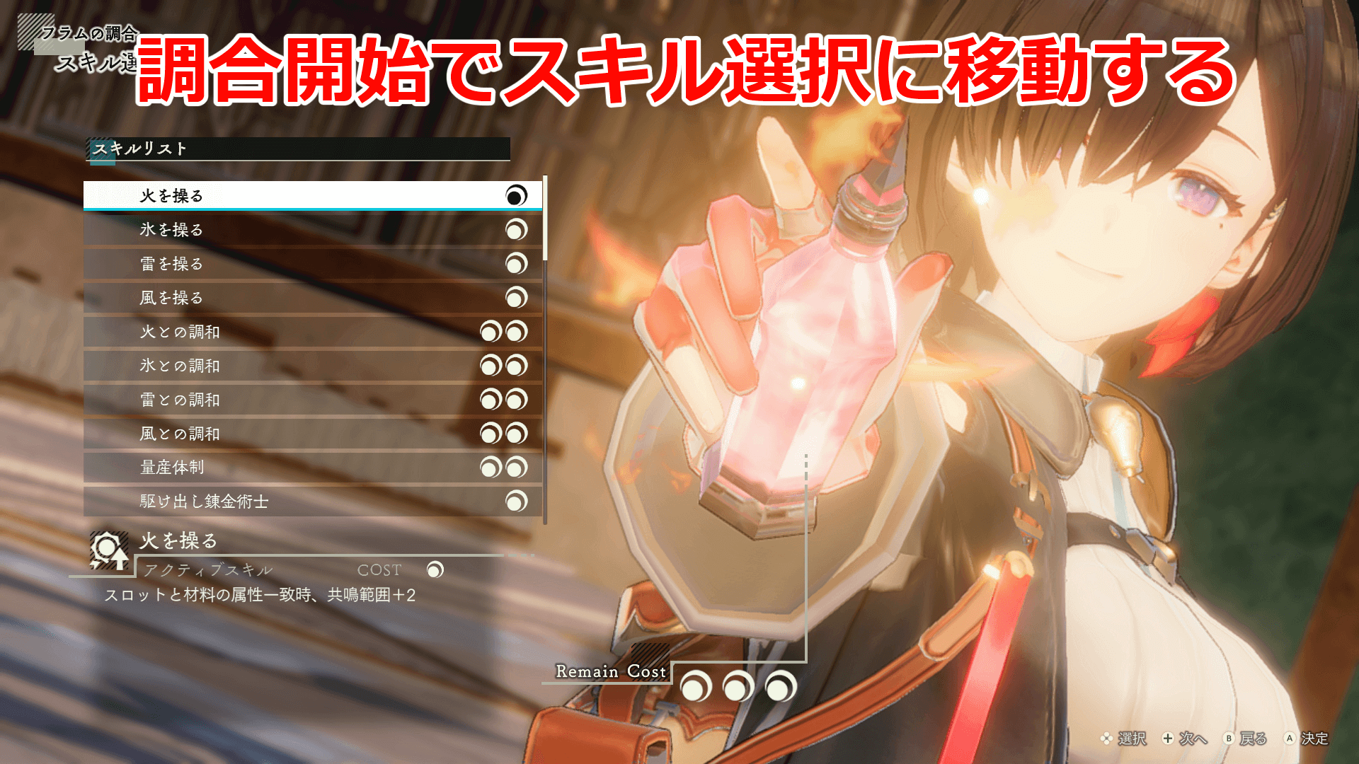 調合スキルは、合計のコストが3まで追加が可能だ。相性が良いスキル同士を組み合わせて、通常よりも品質やステータスを高く調合できる。