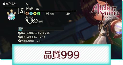 ユミアのアトリエの「品質999」について解説。品質999の作り方(調合方法)と効率的な増やし方についても掲載中。品質999ユミアのアトリエで調合するときの参考にしてください。