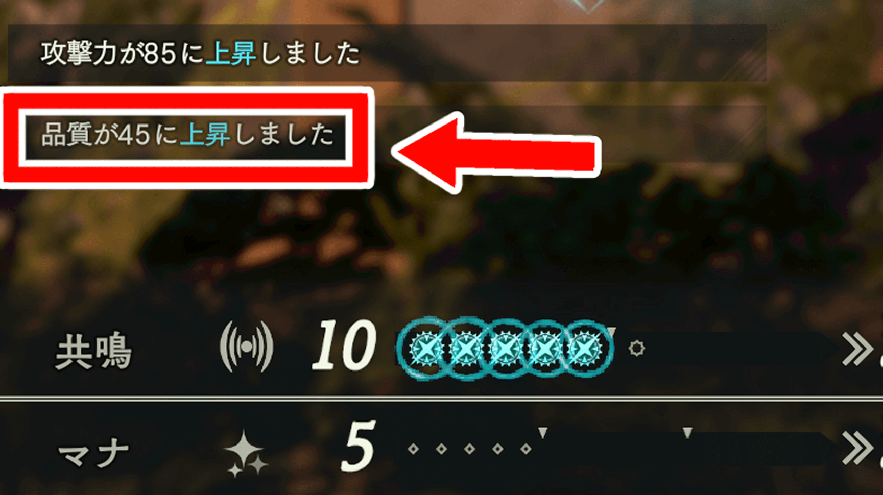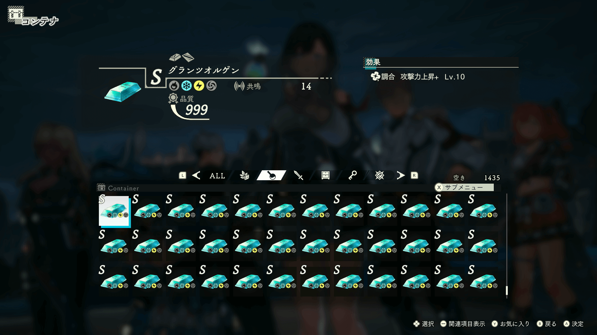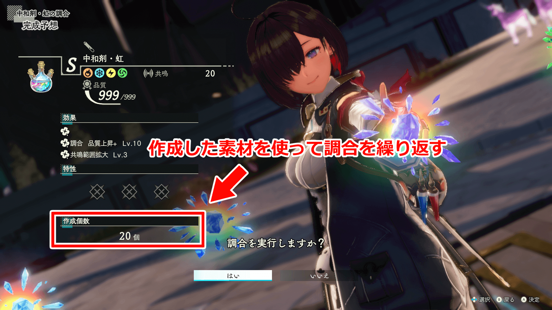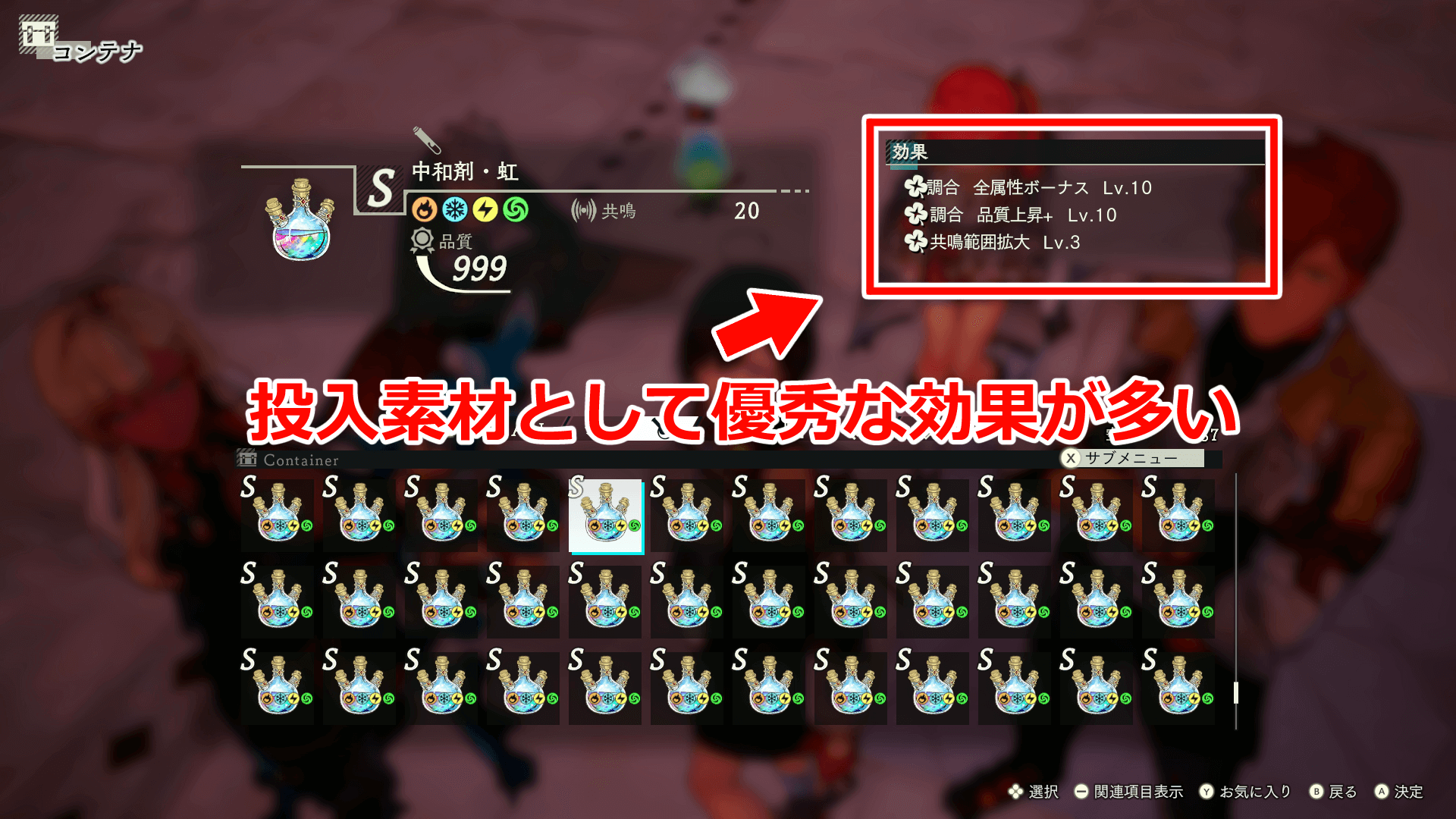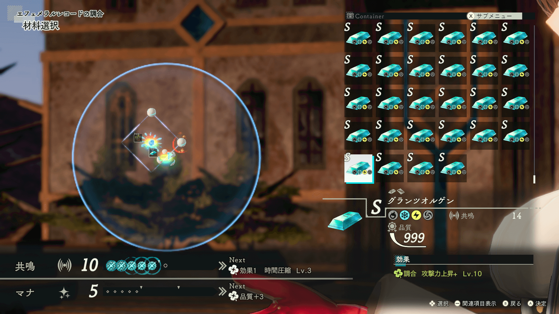 品質が999に届かなかった場合は、作った素材でまた同じ素材を作ろう。品質が高いアイテムは共鳴と範囲が広く、より品質が良い調合が可能になる。