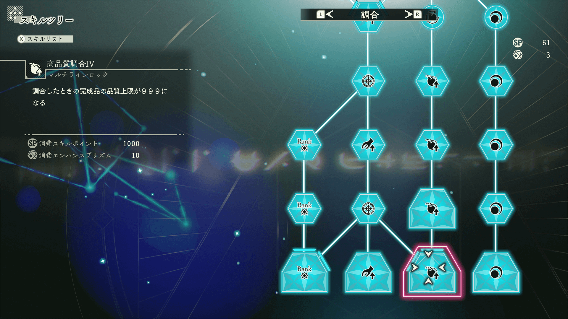 品質999を作るには、スキルツリーから「高品質調合Ⅳ」を開放しよう。高品質調合は解放すると品質の上限が解放されるので、品質999を作りたい場合に必須となる。