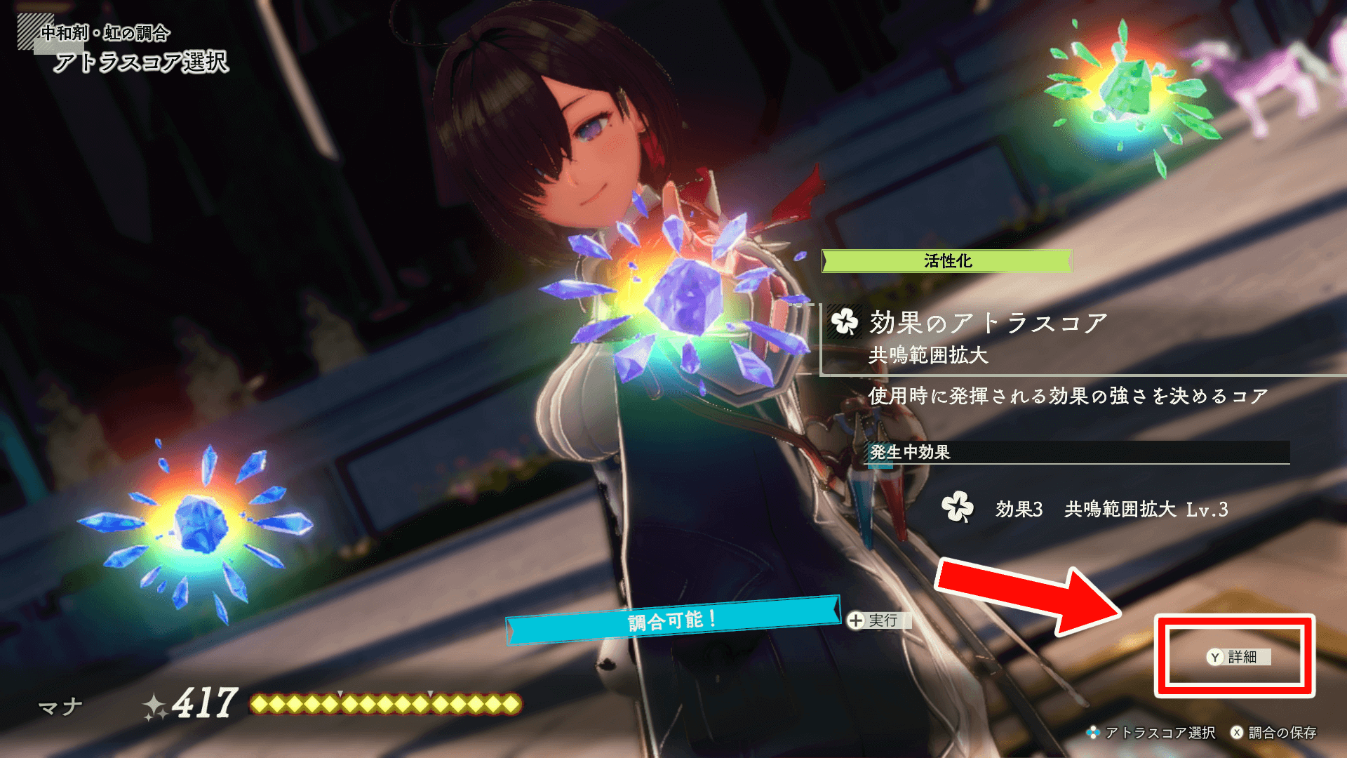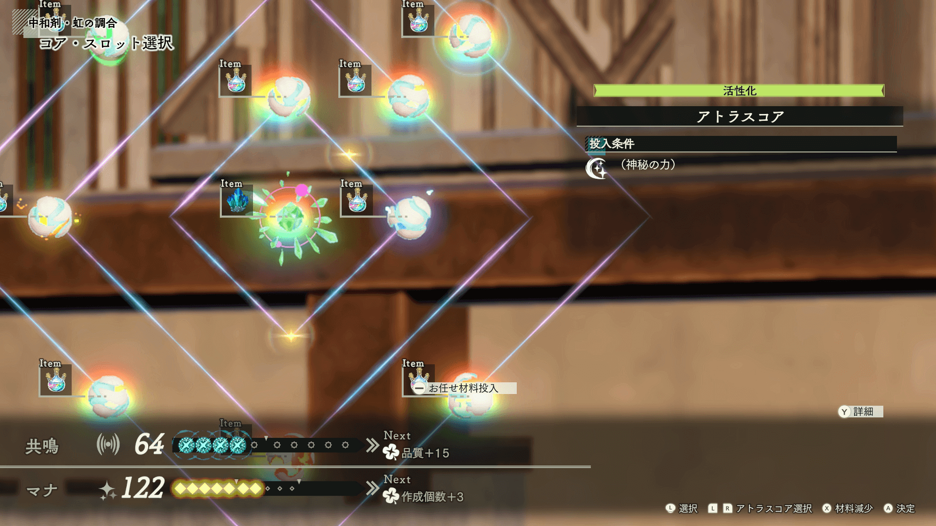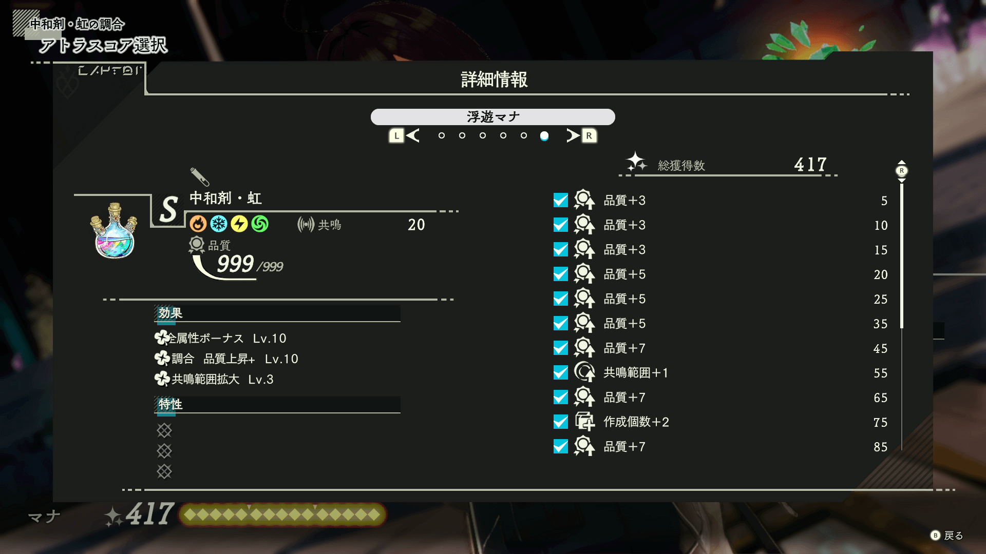 調合画面 詳細画面 品質999を目指すには、全てのアトラスコアをなるべく高品質の素材で埋めて制作しよう。全てのコアを埋めても品質999にならない場合は、中和剤をなるべく高い品質で作成し、作成した中和剤で更に中和剤を作るループで品質999に上げた物を素材にすると良い。