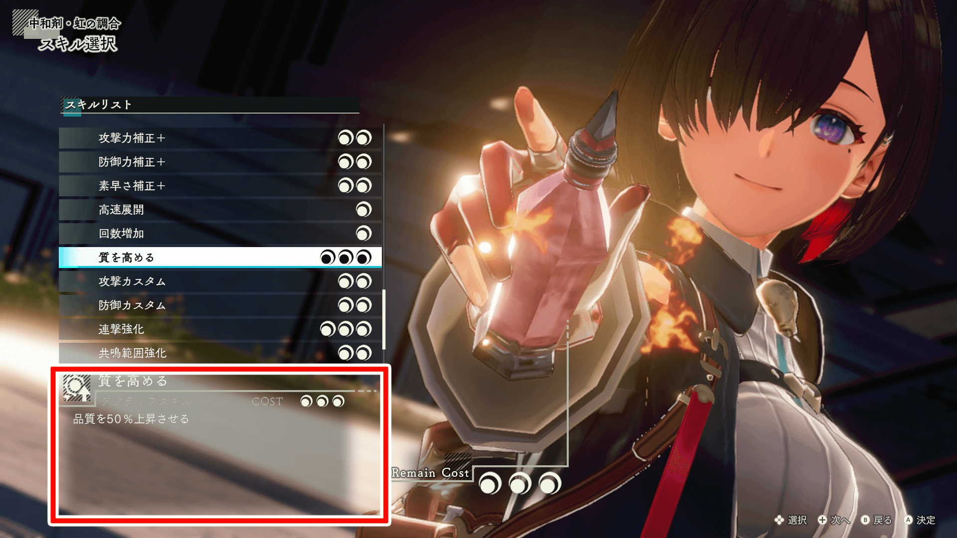 必須ではないが、スキルツリーから調合スキルを解放しておくと、楽に品質UPを目指せる。品質以外にも装備のステータスを上げるスキルも存在するため、最強の装備やアイテムを作る際には解放しておきたい。