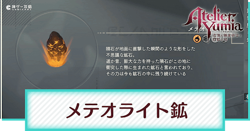 ユミアのアトリエの「メテオライト鉱」について解説。メテオライト鉱の入手方法と使い道、作成できる武器や基本情報についても掲載中。メテオライト鉱ユミアのアトリエが見つからないときの参考にしてください。