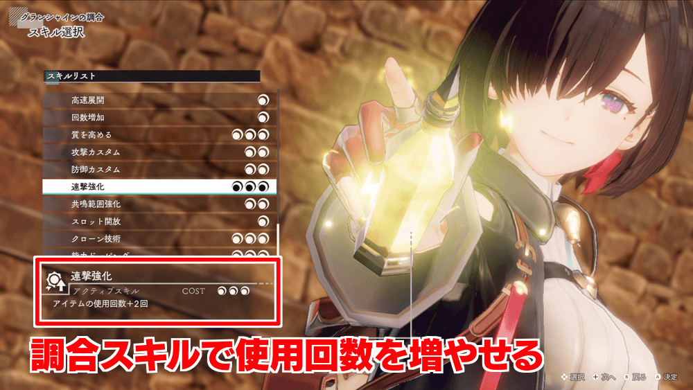 調合スキルを習得すると、通常よりも回数の多いアイテムが作成可能になる。回数を増やせば、リロードに入るまでの火力が伸び、結果的に短時間で与えられるダメージ増加に繋がる。