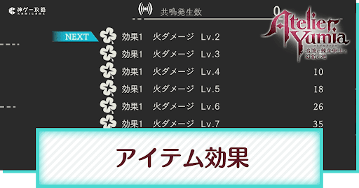 | 属性共鳴・火 | 効果 火属性を持つ調合品の材料として使用することで、共鳴範囲がLv×1増加調合素材 |
