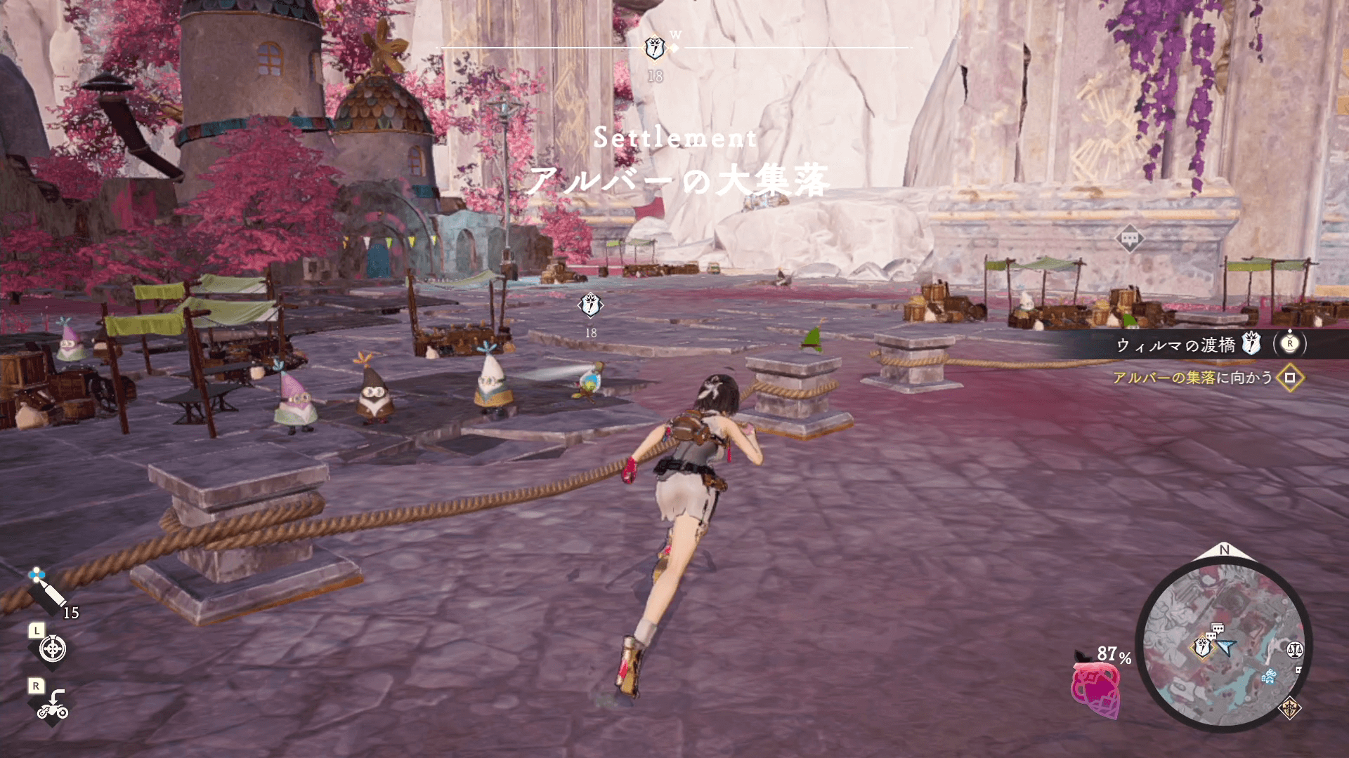 ウィルマの渡橋を受注したら、まずアルバーの大集落にファストトラベルしよう。アルバーの大集落に着いたら、上記の画像の通りすすみジップラインを修理する。修理したジップラインを使って向こう岸に渡ったらウィルマにジップライングローブを渡そう。