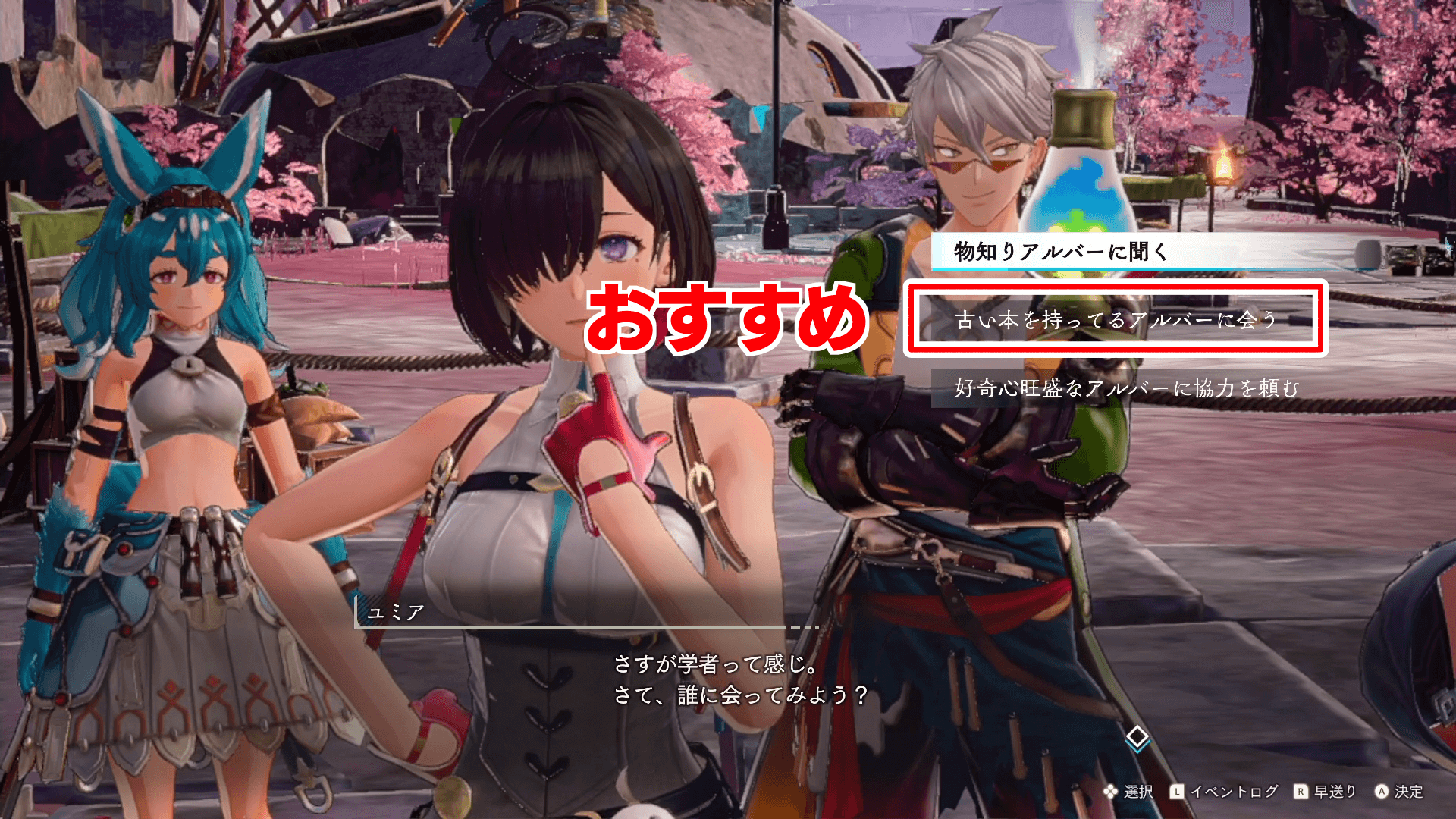 選択肢 内容 物知りアルバーに聞く ハニーマルムの納品 古い本を持っているアルバーに会う 周辺の調査 好奇心旺盛なアルバーに協力を頼む 中級食材セットの納品 ウィルマの渡橋をクリアしたら、3つの選択肢から1つを選ぼう。真ん中の「古い本を持っているアルバーに会う」の選択肢は、アイテム消費がなく場所の調査だけでいいためおすすめ。