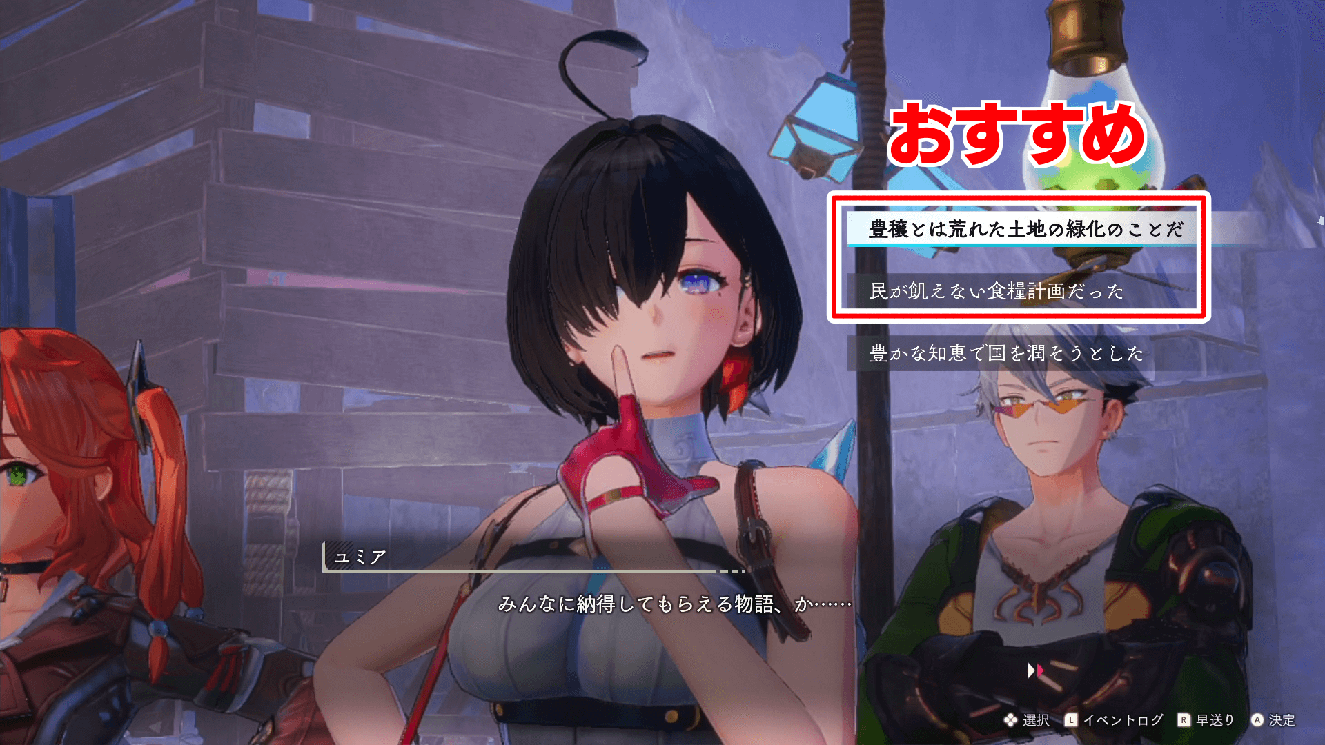 選択肢 内容 豊穣とは荒れた土地の緑化のことだ 広葉樹Aの設置 民が飢えない食料計画だった 倉庫の設置 豊かな知恵で国を潤そうとした 観葉植物A・本棚A・ベンチの設置 「偽りの『豊穣計画』」は、3つの選択肢でクエストが分岐する。どれを選んでも問題ないが、倉庫を配置する「民が飢えない食料計画だった」がおすすめ。