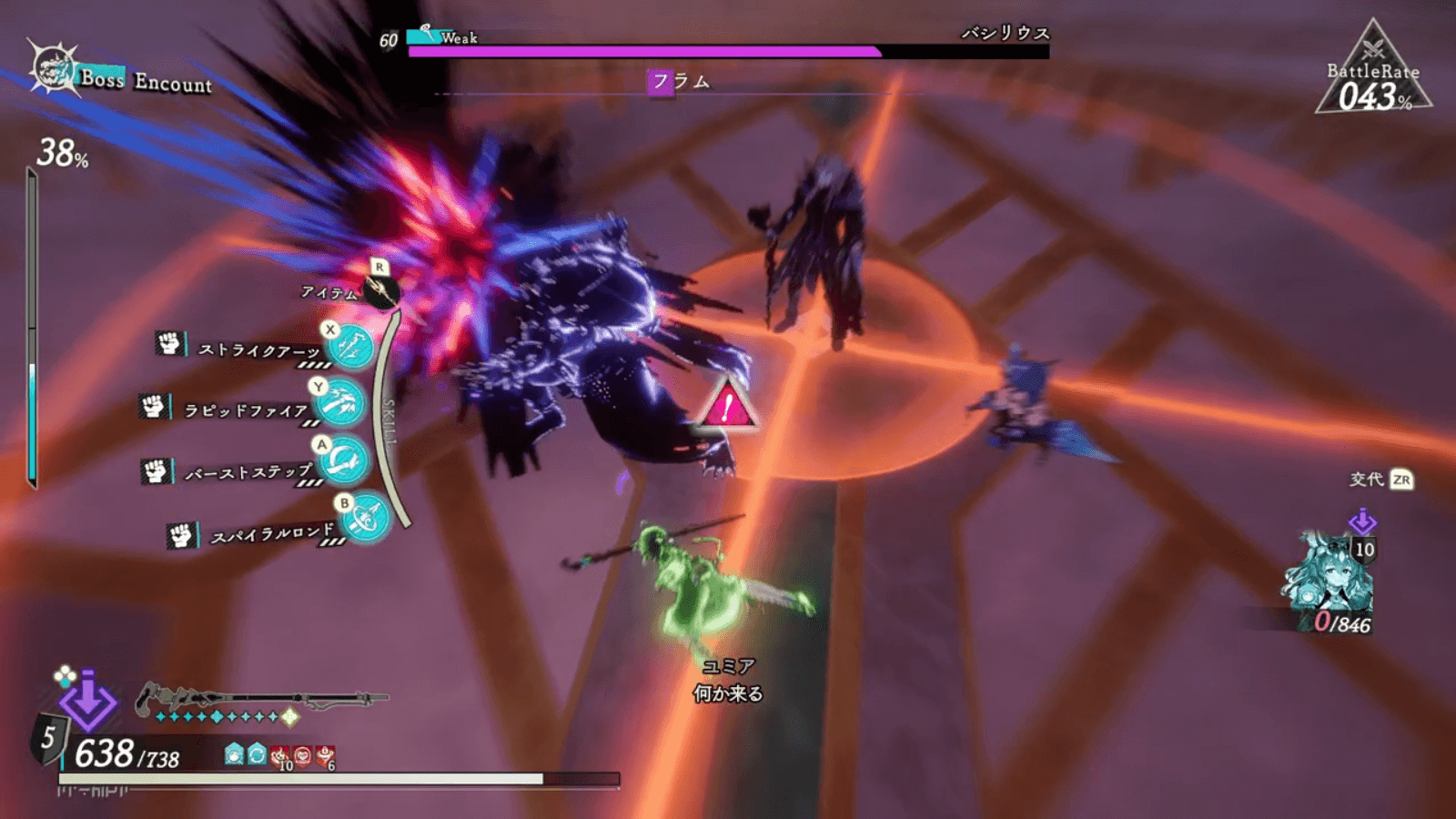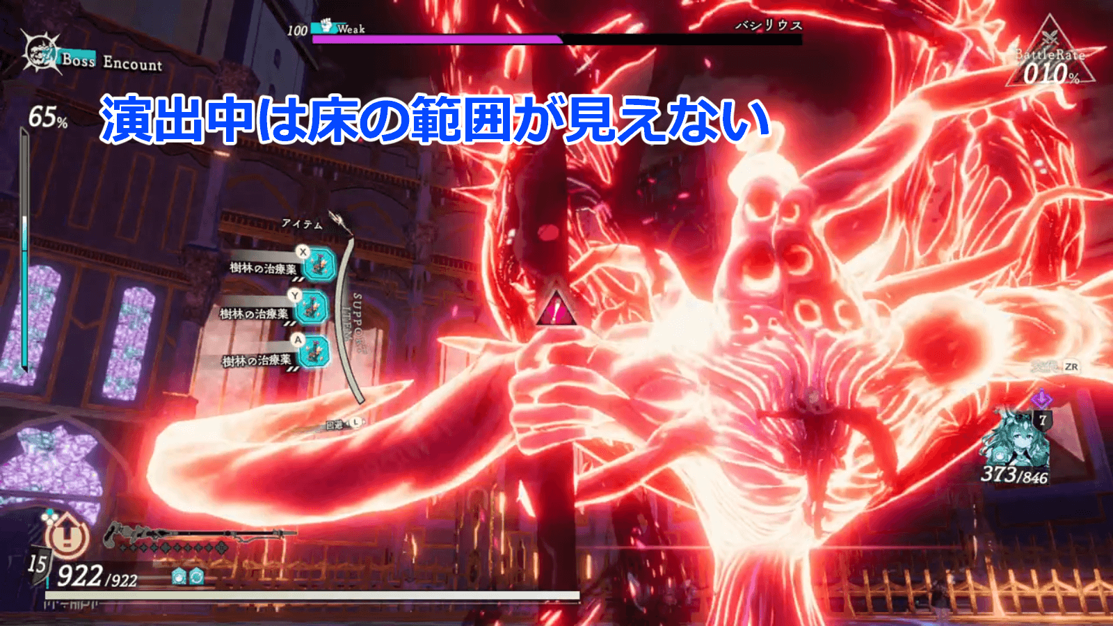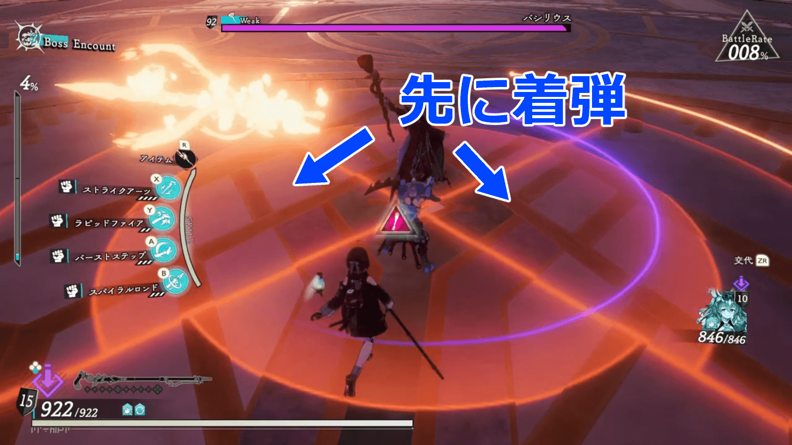 バシリウス第二形態以降は、なるべく操作キャラを背面に移動させながら戦おう。背面以外に全体攻撃を行う技や、、前方に行う攻撃を回避しやすくなる。