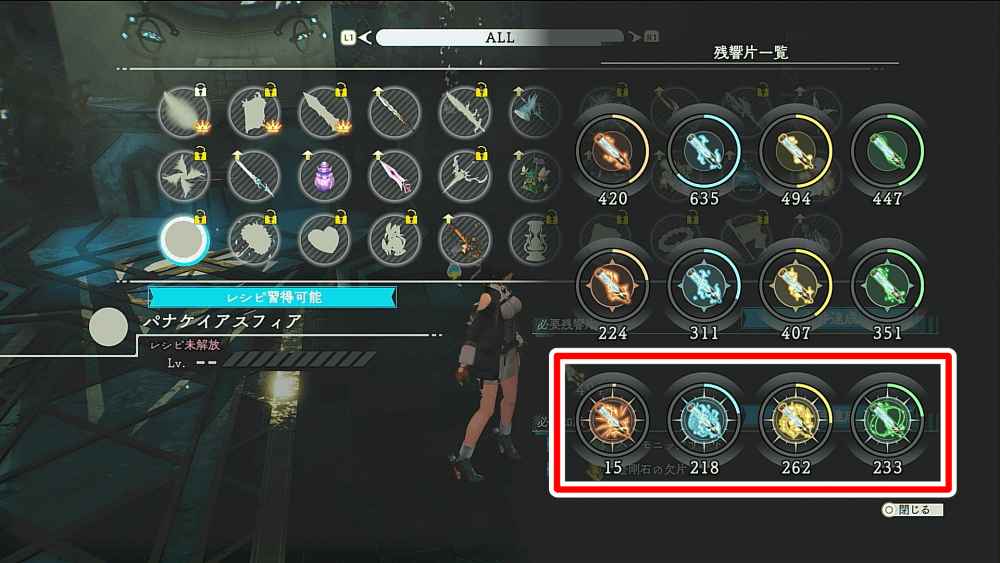 残響片変換の習得後は「残響片・大」を集めれば、中と小は残響片変換のみで補えるようになる。ゲーム序盤に「残響片採取」のスキルを最優先で取得しておけば、効率的なレシピレベル上げが可能だ。