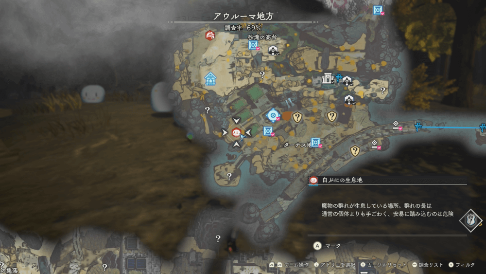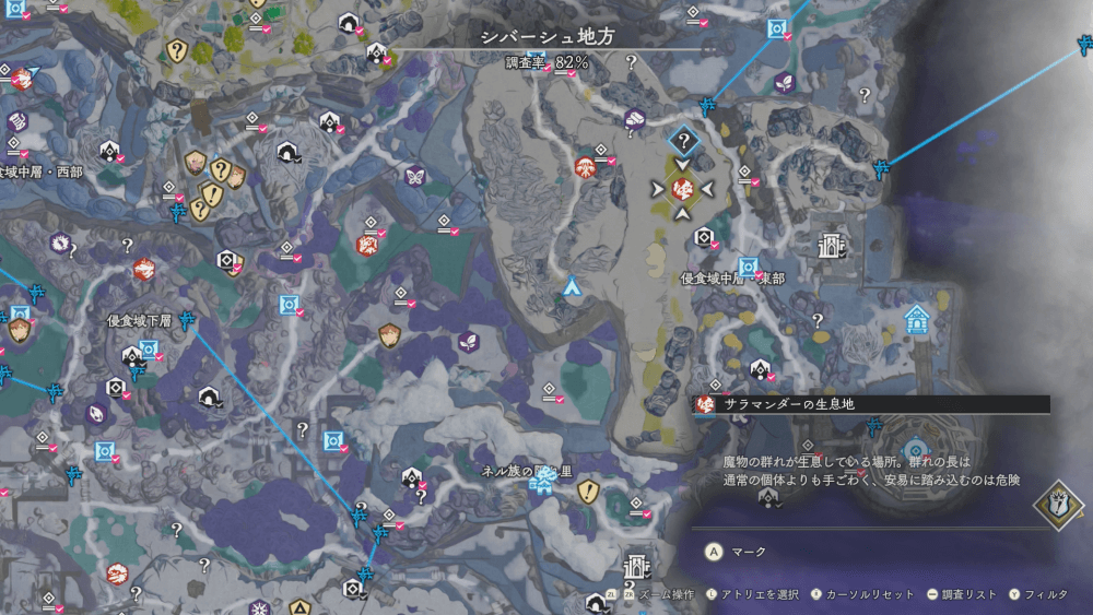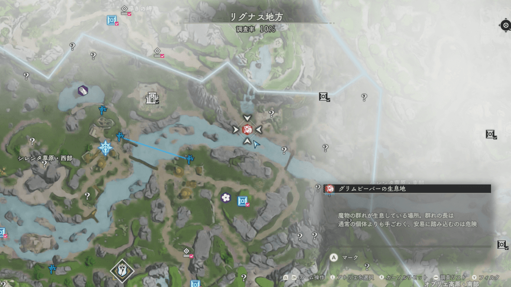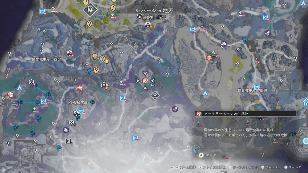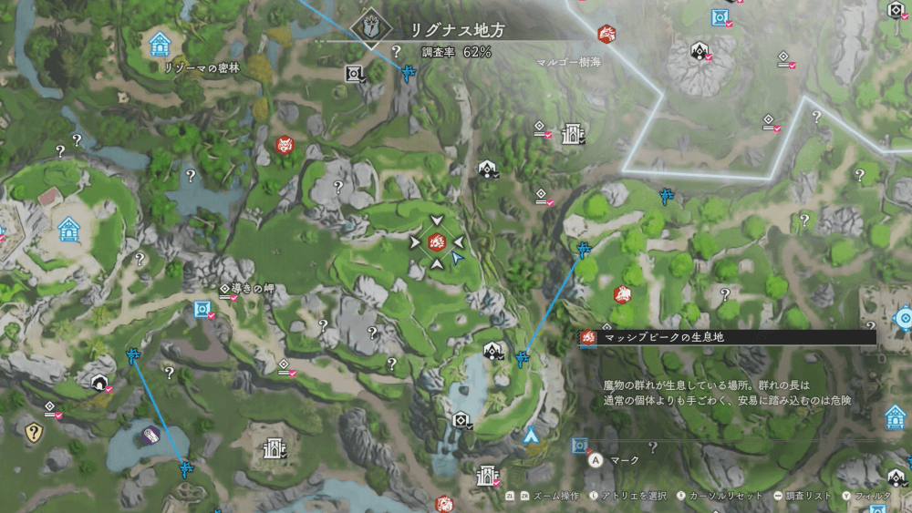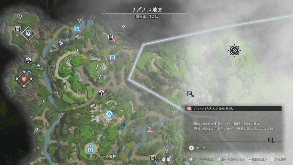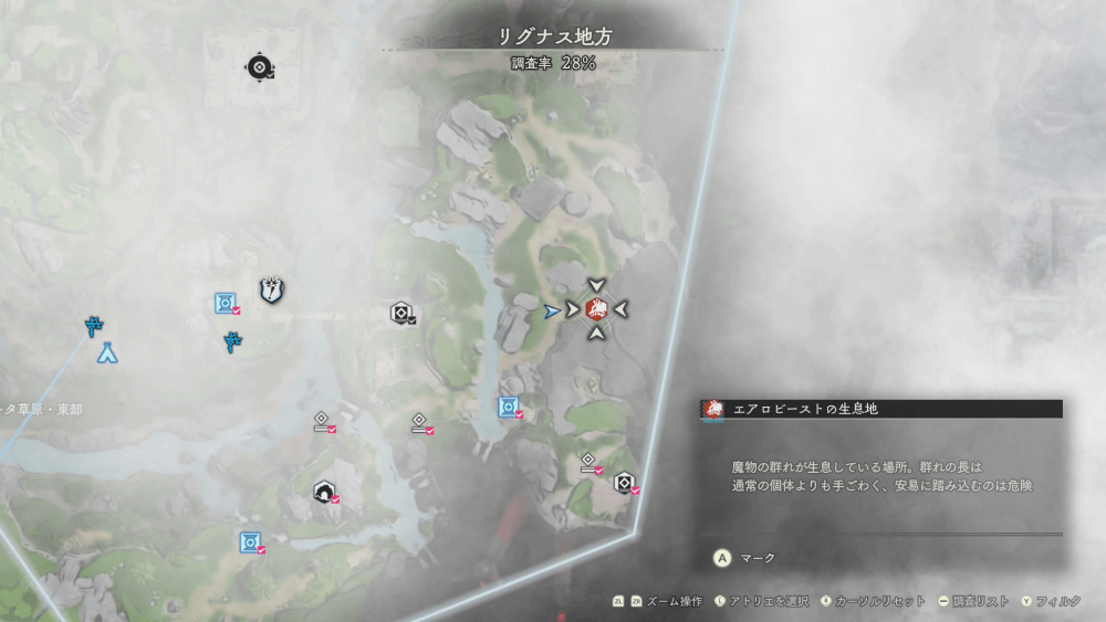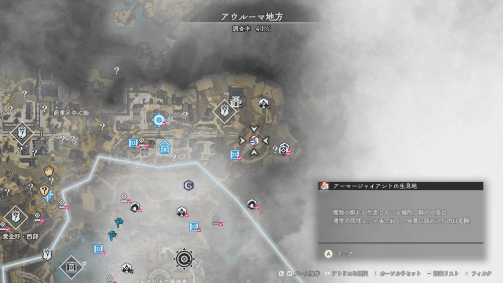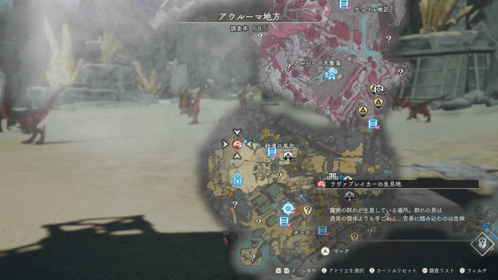 魔物の生息地は、未発見の状態だと「?」で表示されているが、発見するとマップに表示される。マップの調査率にも関わるので、調査率100%を目指す場合はすべて発見しておく必要がある。