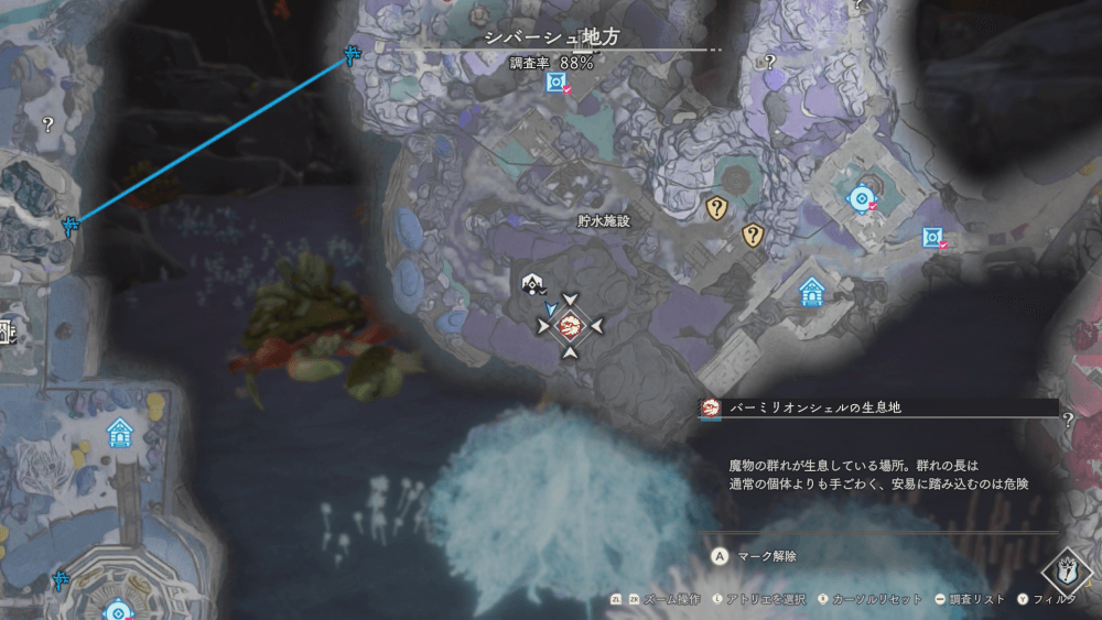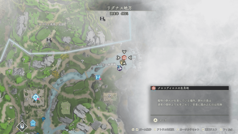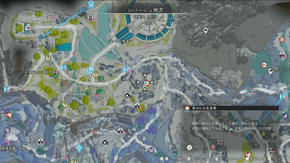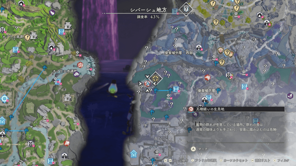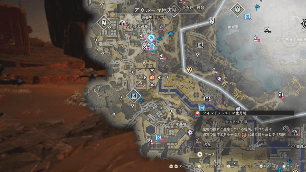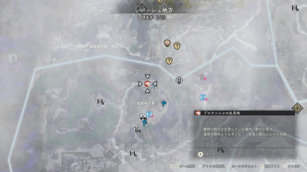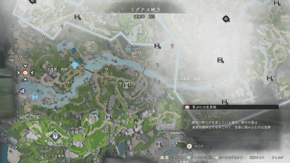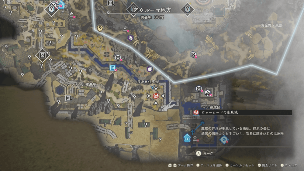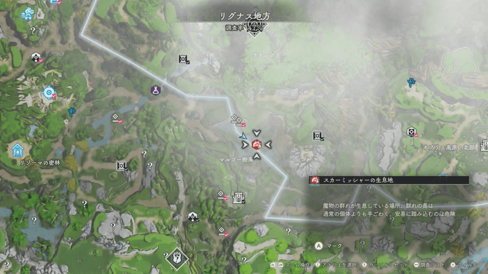 魔物の生息地は、未発見の状態だと「?」で表示されているが、発見するとマップに表示される。マップの調査率にも関わるので、調査率100%を目指す場合はすべて発見しておく必要がある。