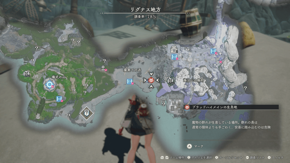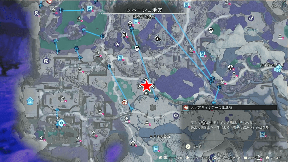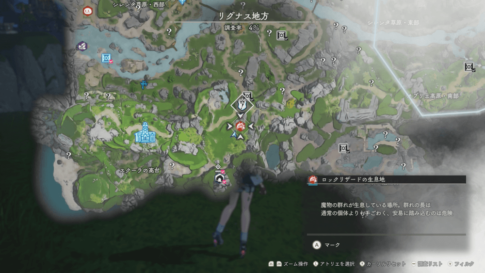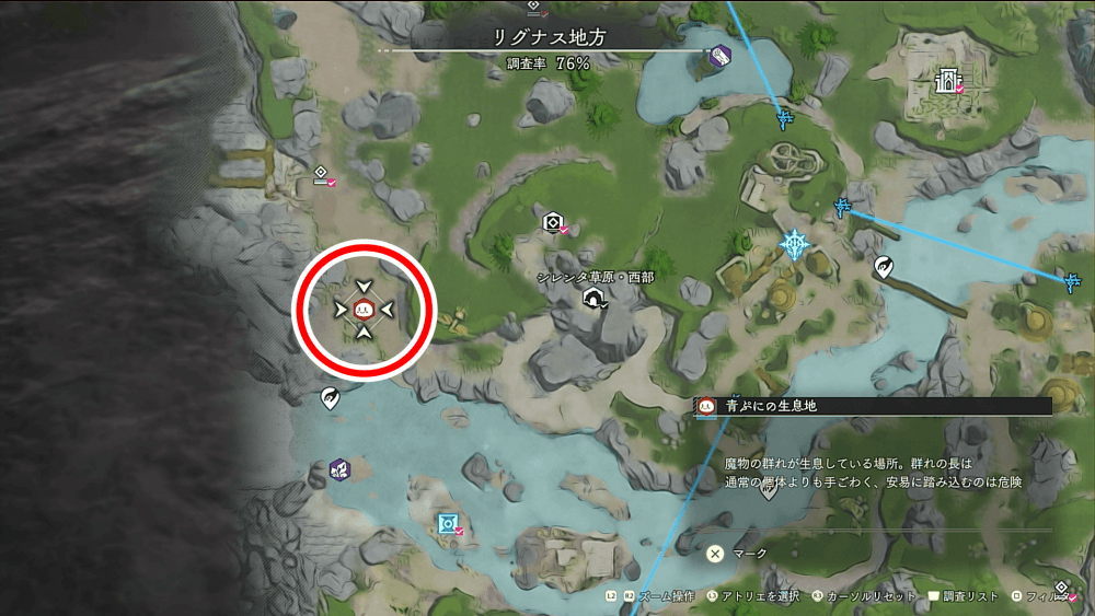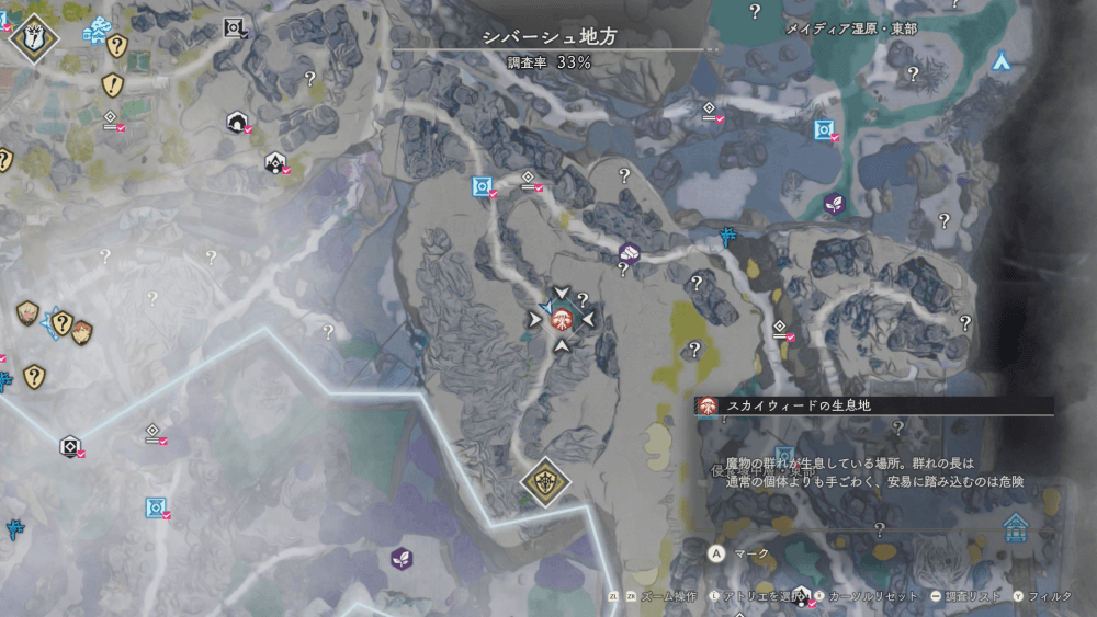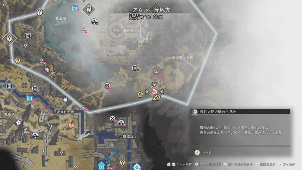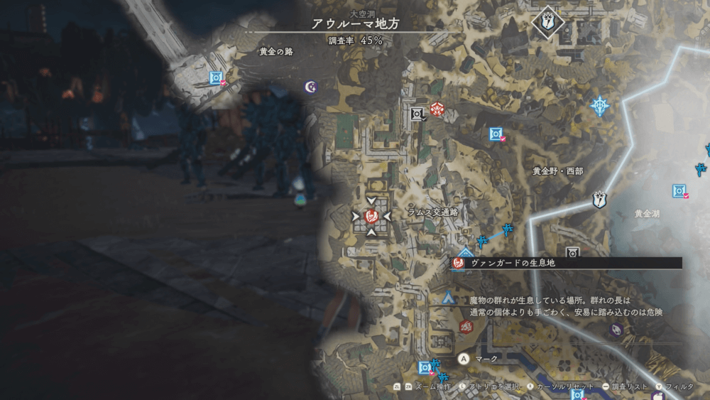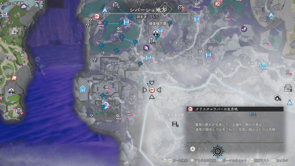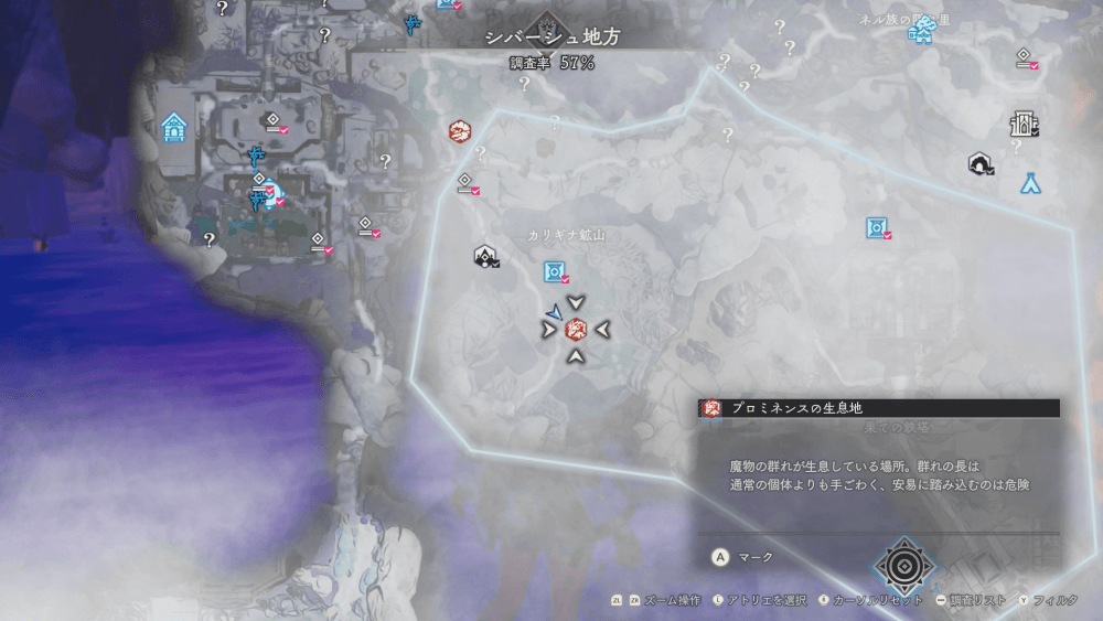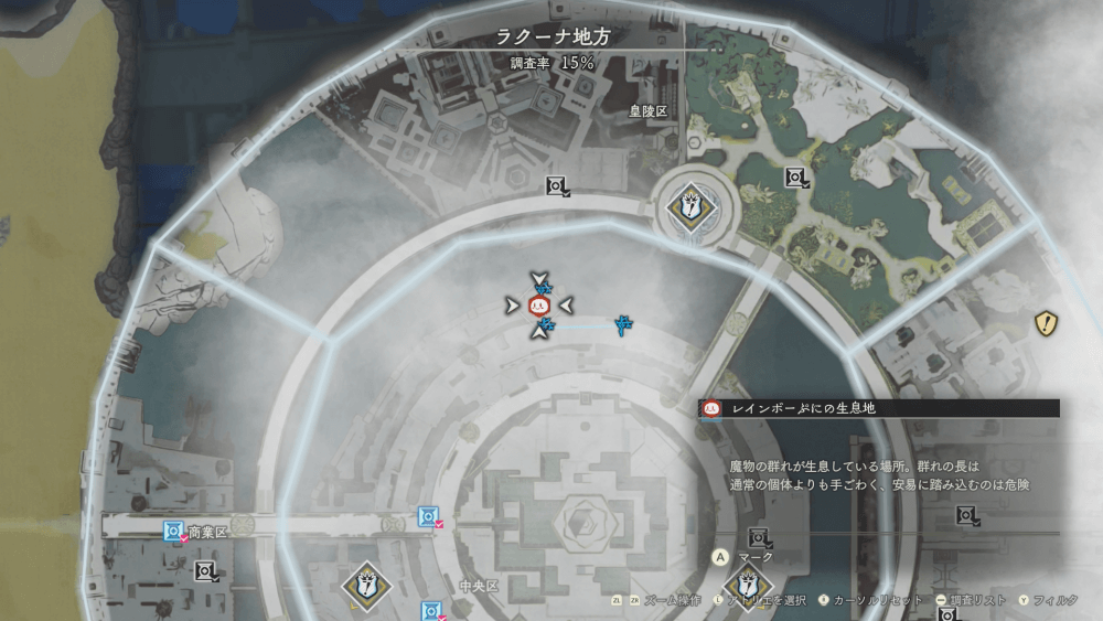 魔物の生息地は、未発見の状態だと「?」で表示されているが、発見するとマップに表示される。マップの調査率にも関わるので、調査率100%を目指す場合はすべて発見しておく必要がある。
