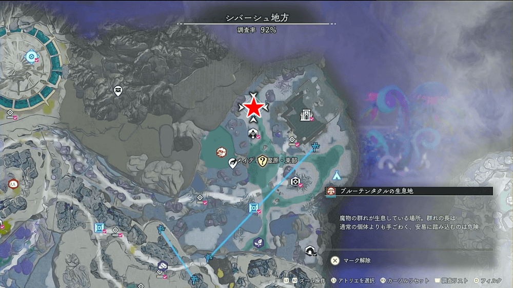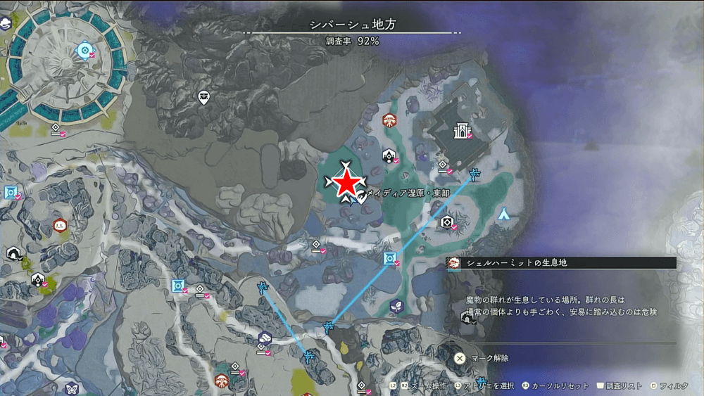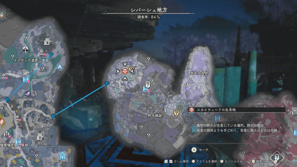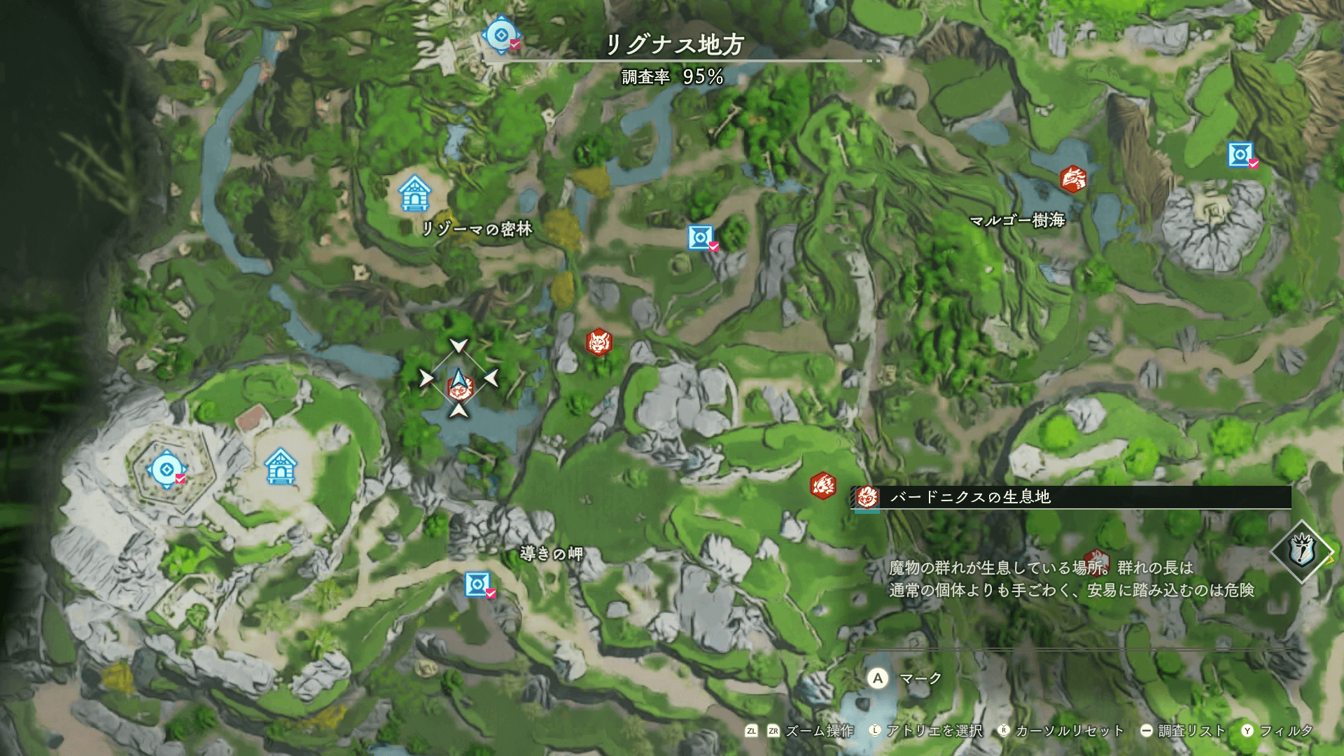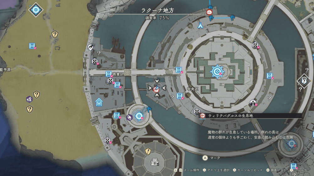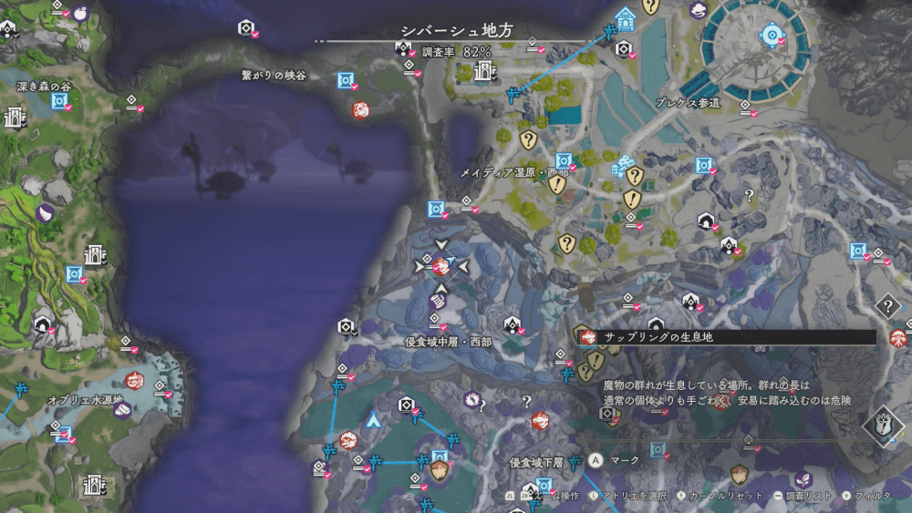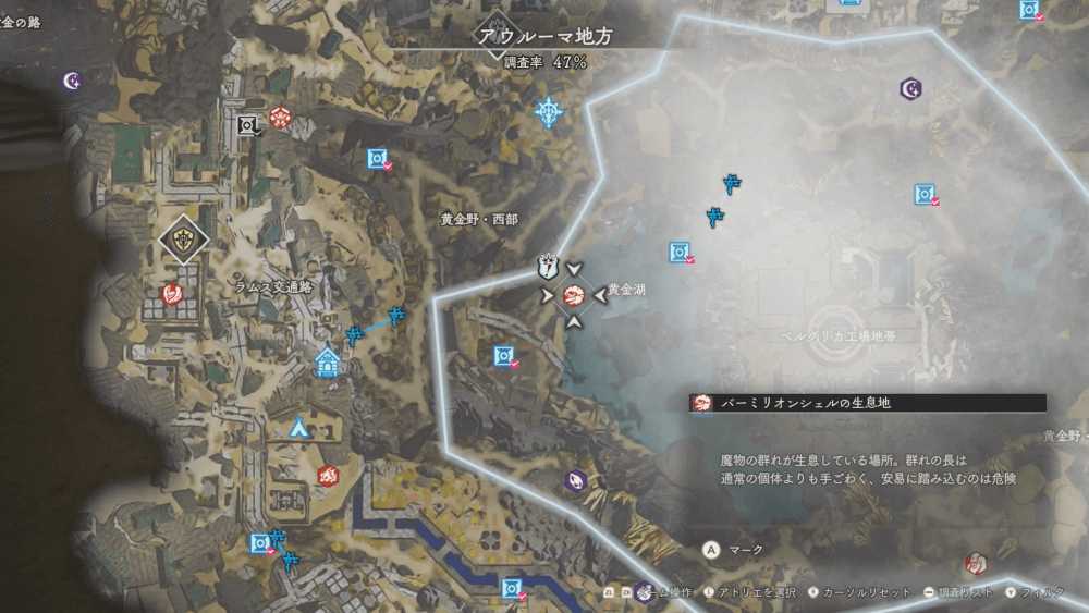 魔物の生息地は、未発見の状態だと「?」で表示されているが、発見するとマップに表示される。マップの調査率にも関わるので、調査率100%を目指す場合はすべて発見しておく必要がある。