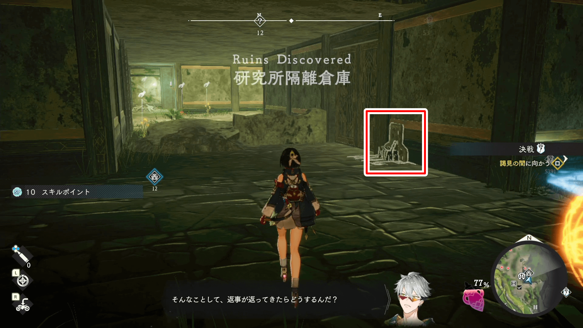 研究所隔離倉庫に入ったら、入口近くのレバーを動かそう。開いた扉の奥に広域スキャンの台があるため、スキャンして宝箱と遺宝を回収しよう。