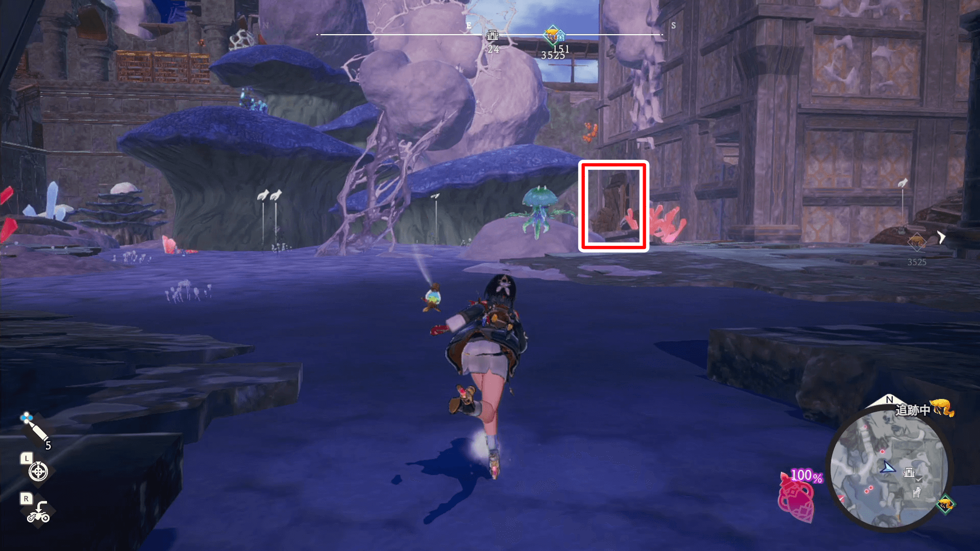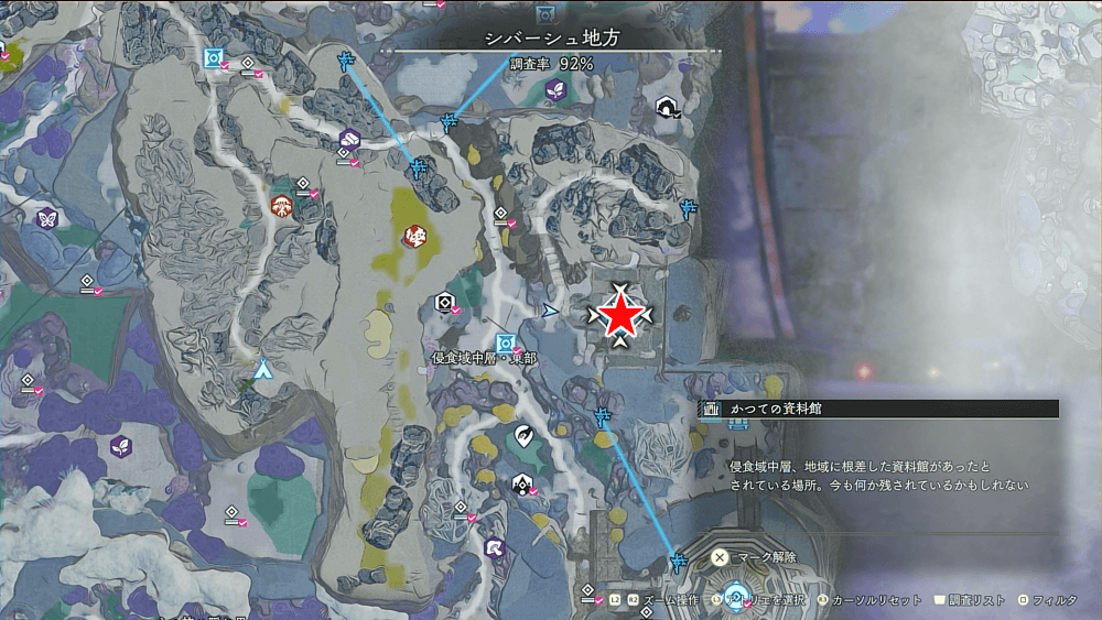 かつての資料館の宝箱と遺宝は、繭に囲まれて回収できない。繭は、切弾を使うと破壊できるため、所持していないときはシバーシュ地方の開拓率を100%にして入手しよう。