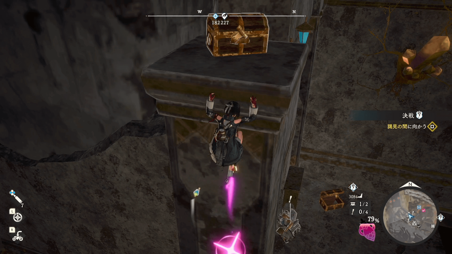 宝箱の1つは、高所に隠されている。瓦礫を登って壁ジャンプで入手しよう。