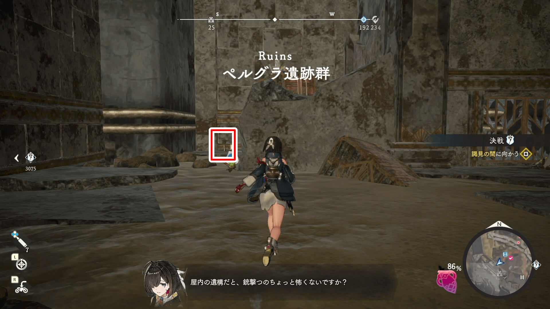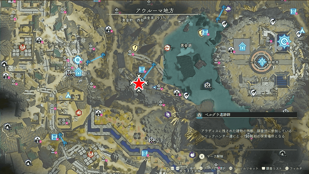 ペルグラ遺跡群の内部に入ったら、正面すぐちかくの広域スキャンを発動しよう。スキャンすると、遺構の宝箱と遺宝の位置が判明するため、すべて回収すればクリアだ。