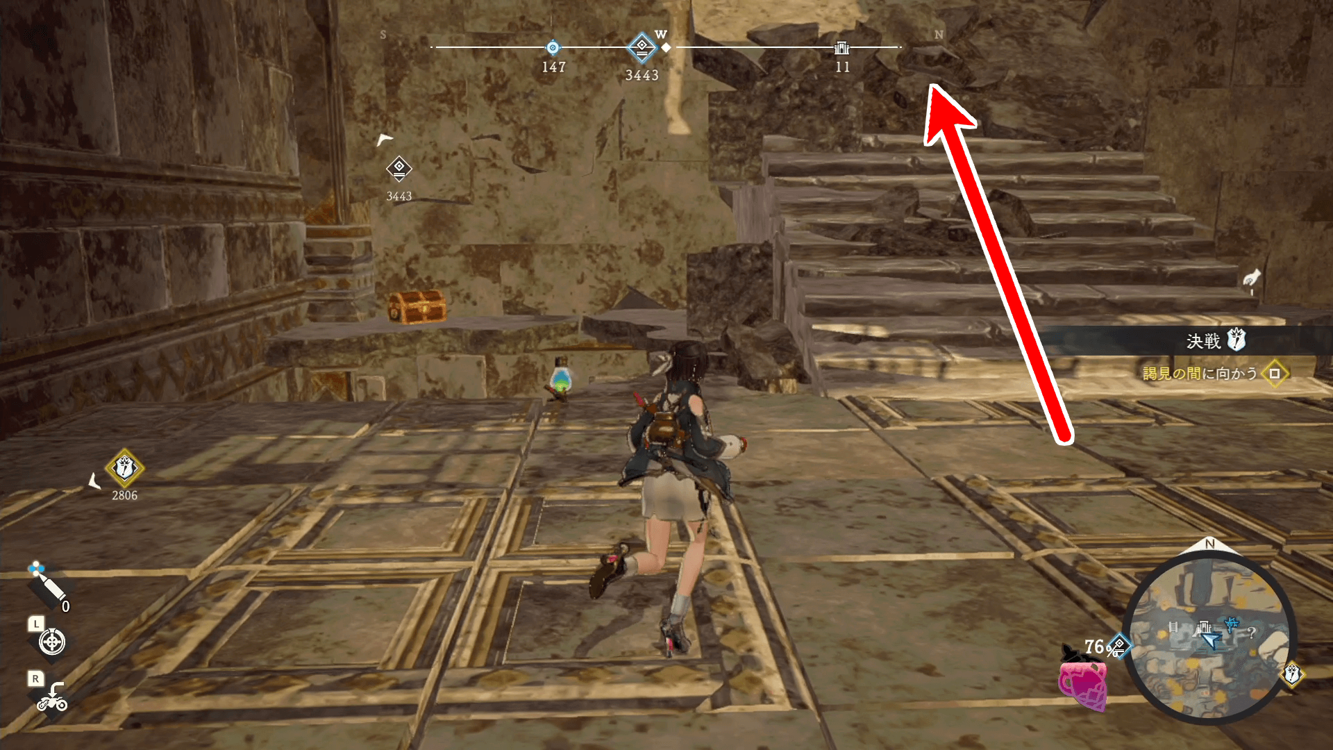 2階に登ったら、3階で広域スキャンを解放しよう。広域スキャンをすれば、遺宝や宝箱の場所と数が表示されるため、すべて回収すればクリアとなる。