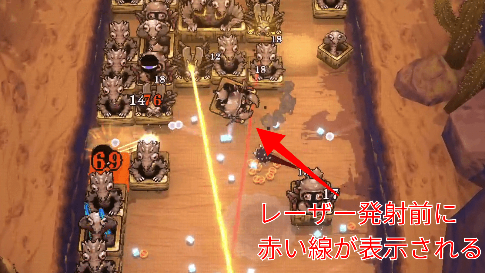 境界×砂漠では、バッタ系の敵がレーザー攻撃を行う。レーザーは発射前に射線が表示されるため、攻撃範囲に入らないように移動して避けよう。避ける際は大きく移動すると回避できる場所が少なくなってしまうため、少しずつ横移動で避けるのがおすすめだ。