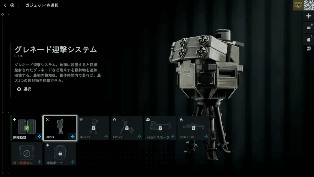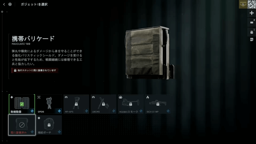 ガジェット2の枠には、携帯バリケードかグレネード迎撃システムを装備しよう。どちらもエリア取りに有効なガジェットであるため、屋内戦闘が多い場所では迎撃システム、屋外で遮蔽が少なければバリケードを優先して装備すると良い。