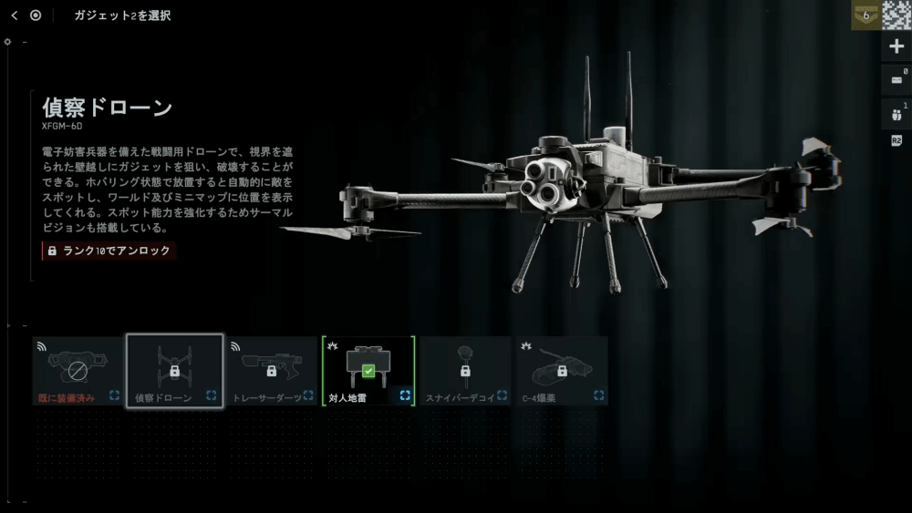 壁越しにガジェットを破壊できる ホバリング時、自動で敵をスポット サーマルビジョン搭載 |