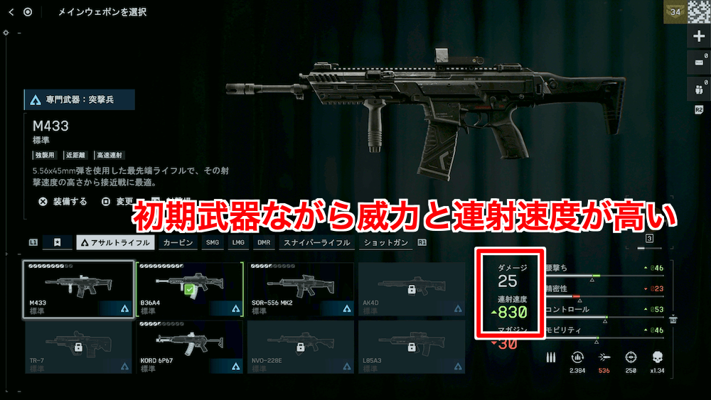 M433はアサルトライフルの中でも連射速度とダメージのバランスが良く、腰撃ち時の精度も良好なため、近距離戦で特に活躍できる。マガジン容量もカービンなどと比較して多いため、複数人相手で息切れしづらい点も優秀だ。