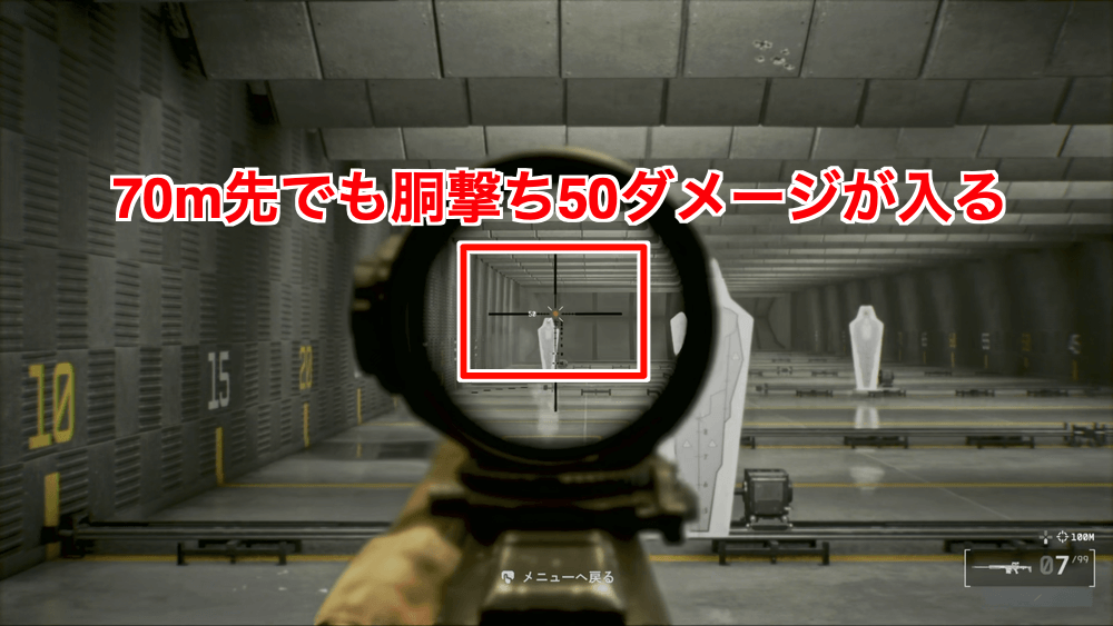 | 簡易評価 | ・約80mまで2発キル ・セミオートSRのような感覚で使える ・反動はアタッチメントで制御する |