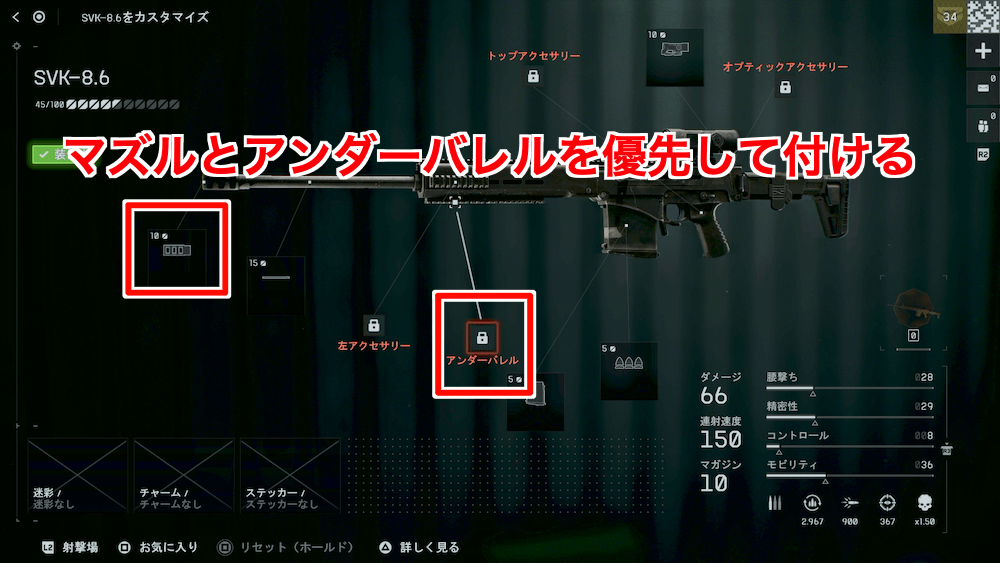 SVK-8.6は胴撃ち2発でのキル成功率を高めるために、反動軽減を多く積んだ構成を目指すと良い。主にマズルとアンダーバレルの強化に特化させ、他の能力を削ってでも反動を改善させると、素早い2連射で敵を倒しやすくなる。