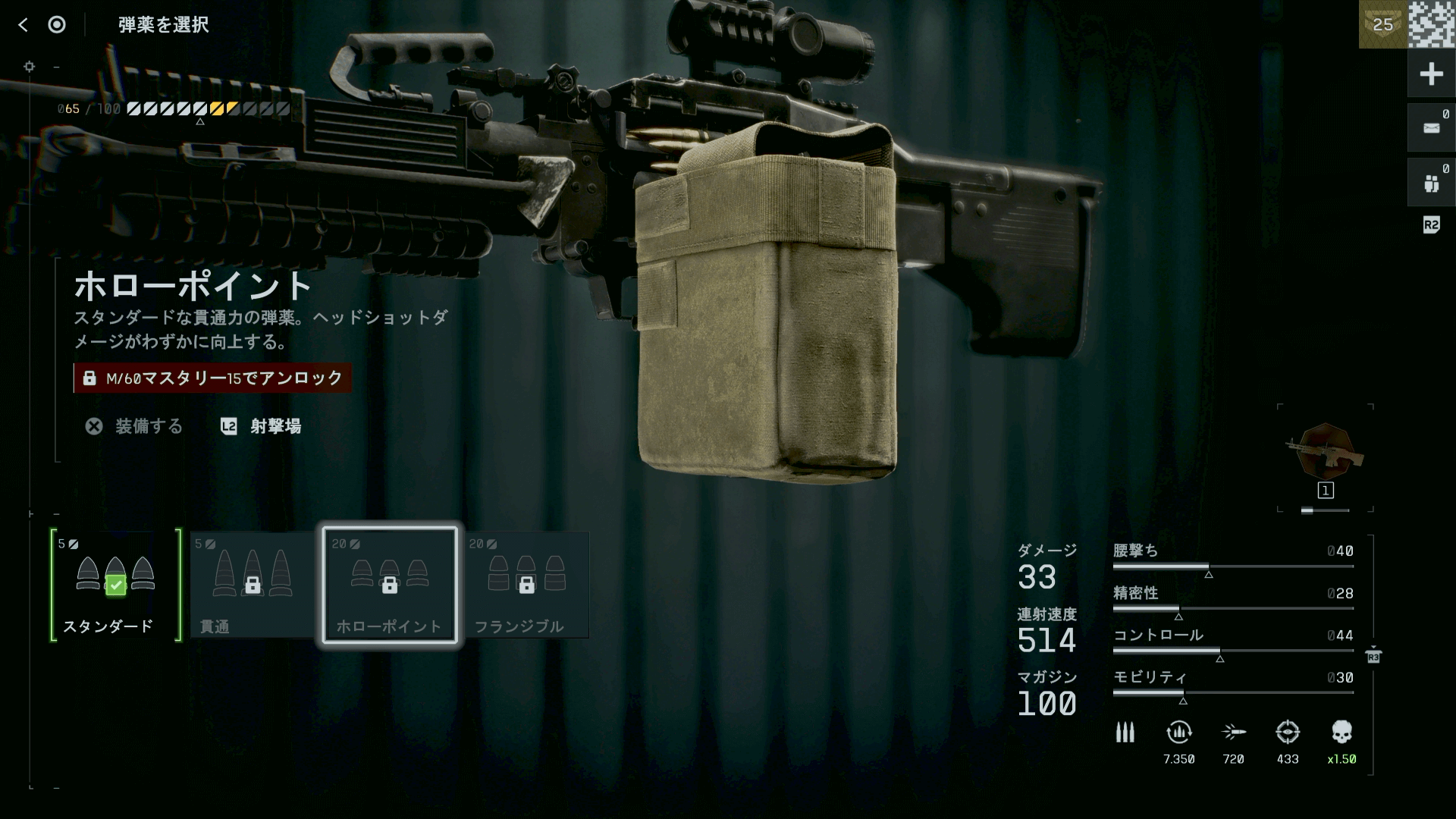 M/60は発射レートが遅い代わりに、1発33ダメージの高威力弾を持っているため、ホローポイント弾の恩恵が大きい。近距離であればヘッドショット2回でキル可能なため、腕次第では近距離の敵を素早く倒せる。