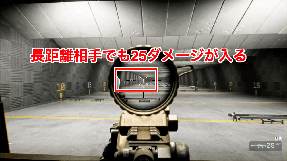 M250は表記上のダメージ/連射速度は低い部類だが、70mまで一切距離減衰を起こさず、最大火力を維持し続ける。25m以降はダメージ33のLMGよりもTTKが高くなり、見た目以上に高い攻撃性能を発揮する。