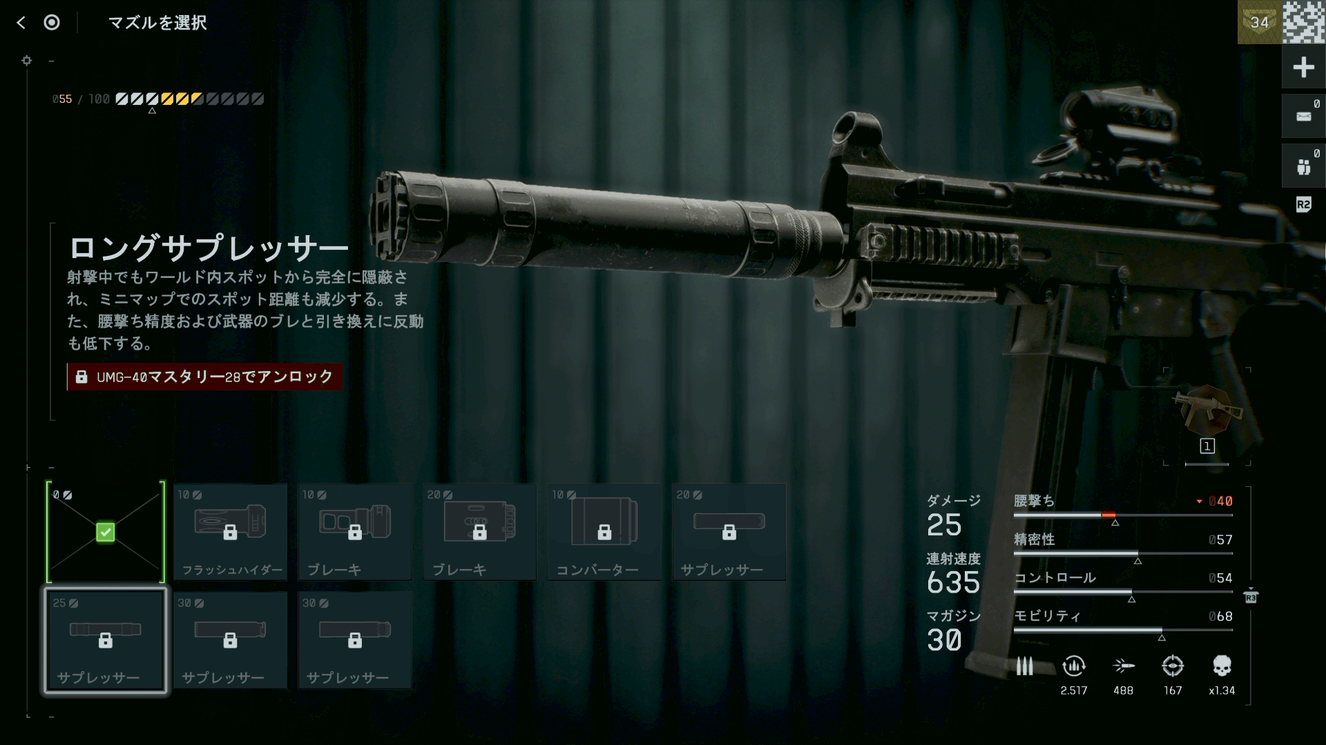 UMG-40は他のSMGのような接近戦では撃ち負けるため、中距離以遠での撃ち合いを意識した構成を組み、LMGに近い立ち回りを意識しよう。腰撃ちや至近距離の取り回しを多少犠牲にしてでも、サプレッサーや反動/射撃精度を伸ばすと、取り回しの良い中距離支援火器になる。