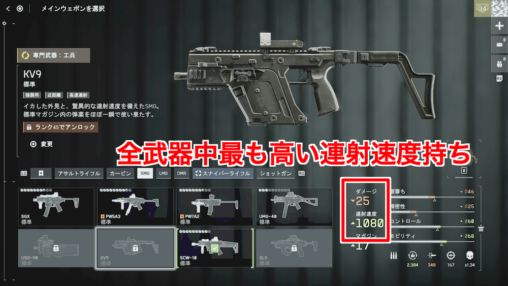 KV9は全武器中で最も高い連背速度を誇り、平均値以上の単発ダメージと合わせ、極めて高い瞬間火力を持つ。特に至近距離戦での火力が凄まじく、9m以内でのTTKは全武器中でもトップの性能だ。近距離の撃ち合いで強くなりたい場合は、KV9を解放して使っていこう。