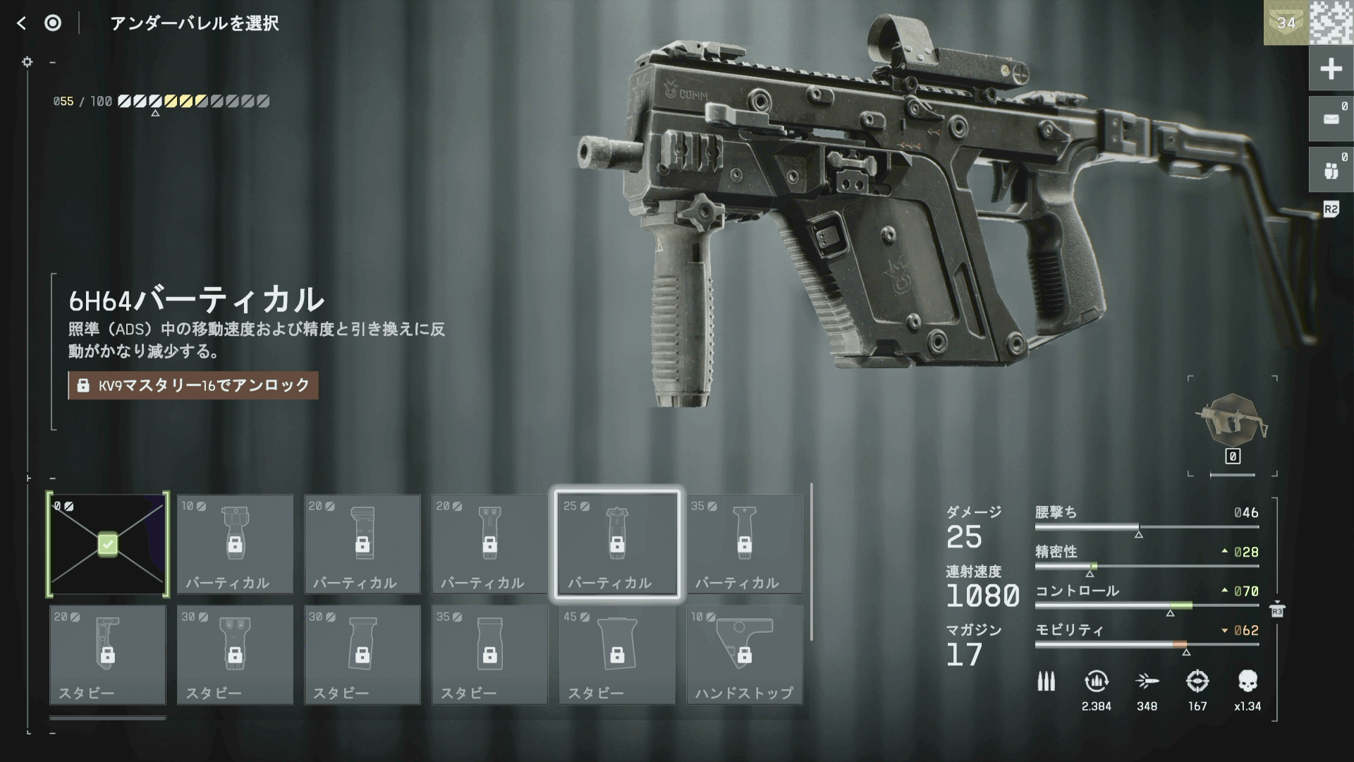 KV9は高威力の代わりにやや反動が高めなため、反動軽減系のパーツを多めに採用すると良い。また、腰撃ちする頻度も高いため、レーザーサイトで腰撃ち精度を補っておくと、より命中率が改善される。