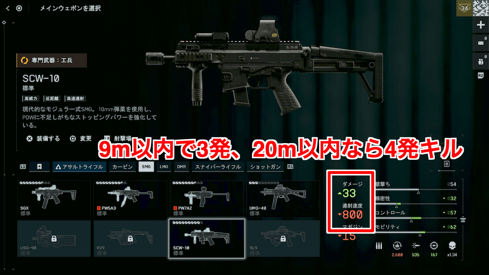 SCW-10はSMGの中で最も単発火力が高く、威力に対して高い連射速度も備えるため、極めて高い瞬間火力を誇る。火力だけでなく射撃精度も優れており、高火力かつ中距離まで対応できるSMGとして、極めて強力な武器に仕上がっている。