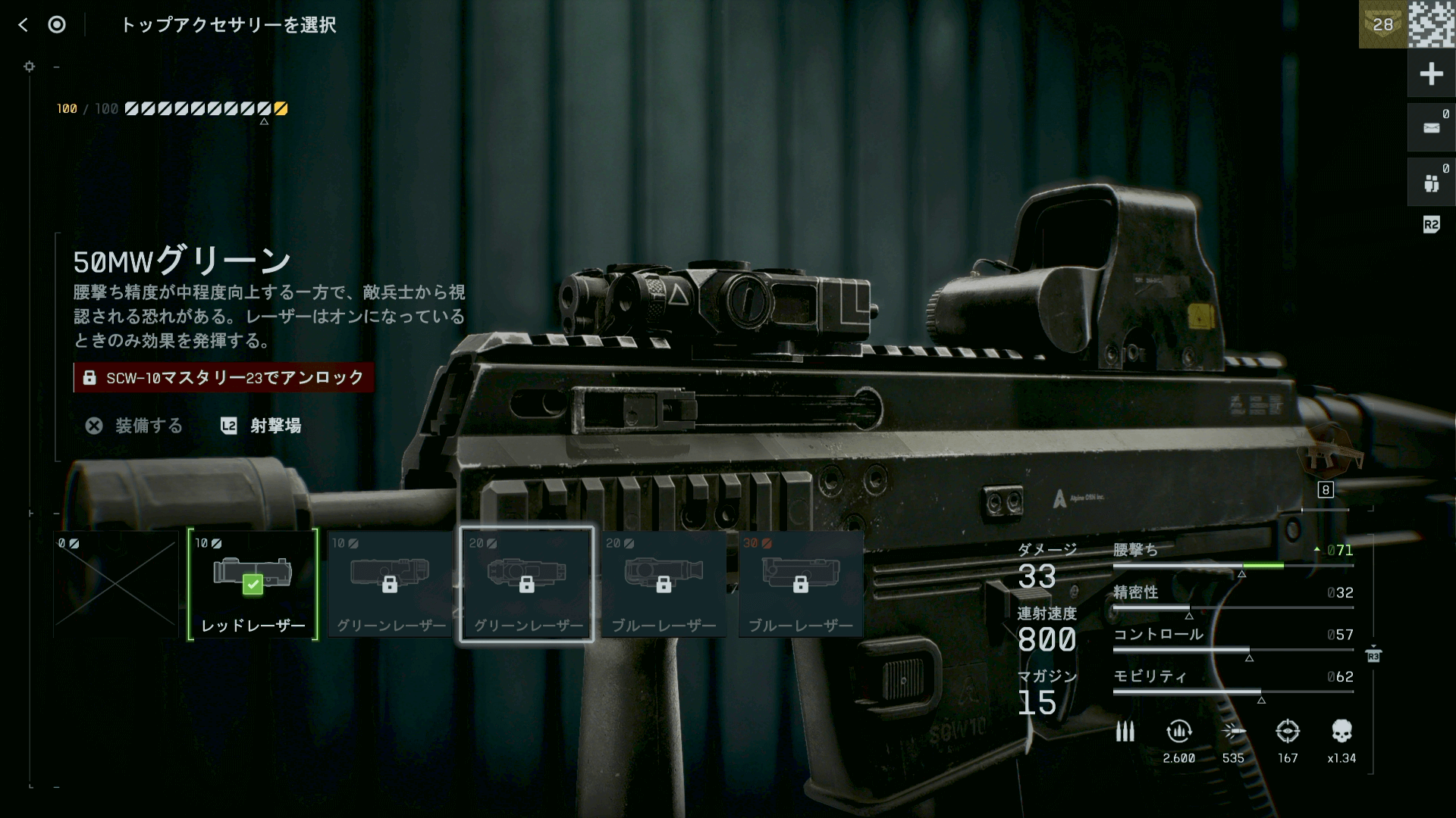 | 簡易評価 | ・約50mまで5発キル ・近距離でのキルタイムが早い ・屋内戦闘なら腰だめ撃ちも有効 ・15発と少ない装弾数が短所 ・25発マガジンを解放すれば短所を補える |