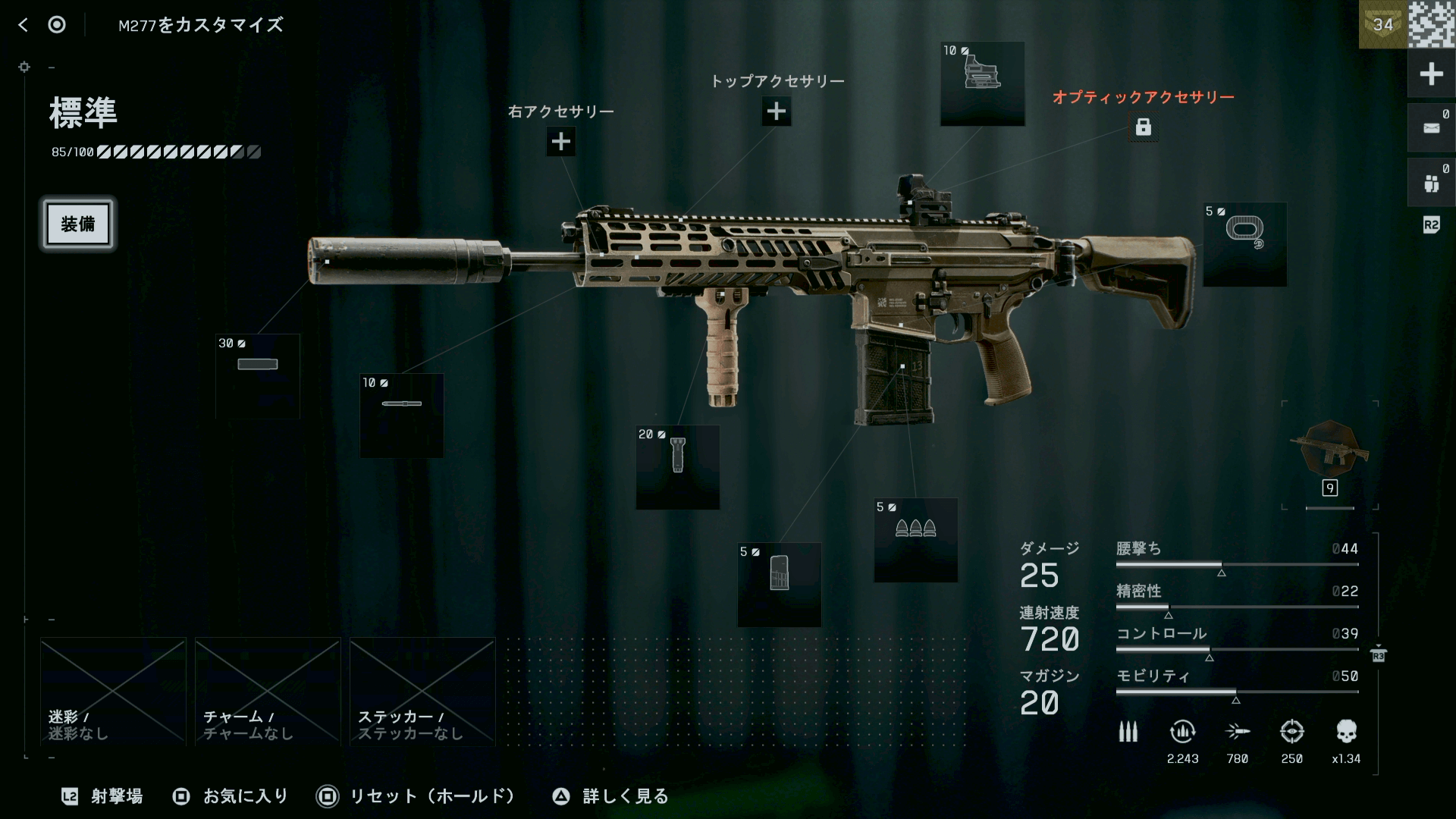 M277で採用したいパーツの多くはマスタリー20〜30以降での解放となり、強化に時間がかかる。最初から軽量サプレッサーが付いているものの、コストが重く、他パーツに影響が出る。マスタリーが上がったらすぐにパーツをチェックし、少しずつ強化を進めていこう。